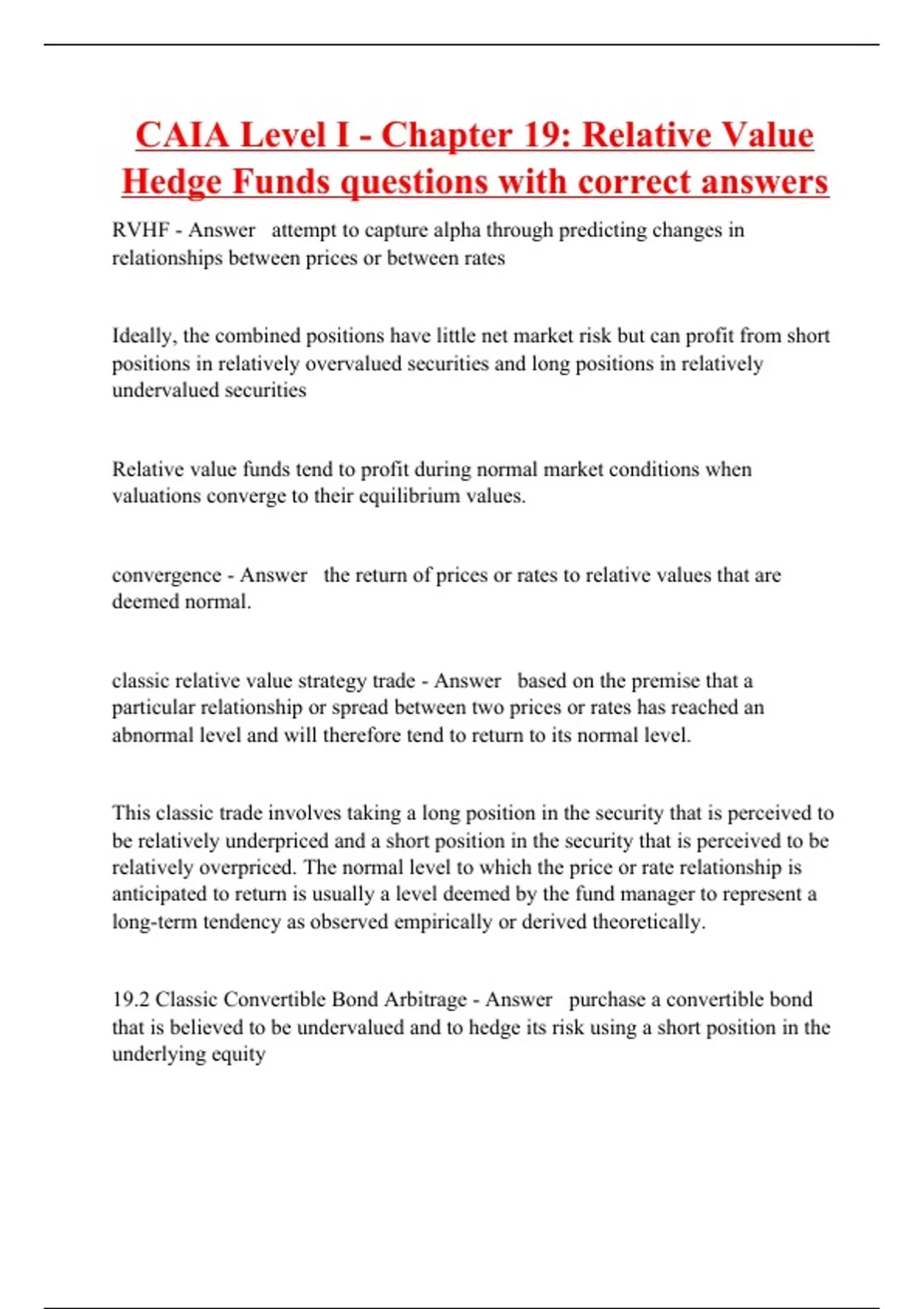CAIA Level I - Chapter 19: Relative Value Hedge Funds questions with correct answers