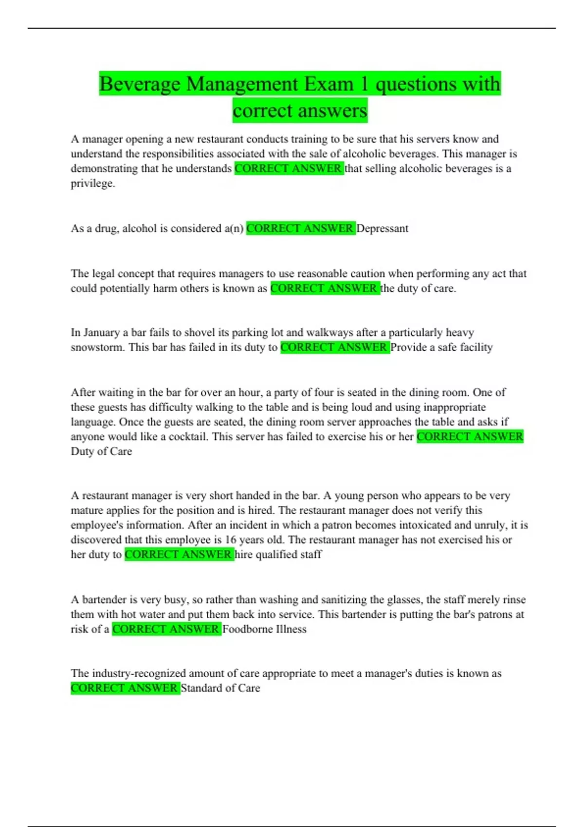 Beverage Management Exam 1 questions with correct answers