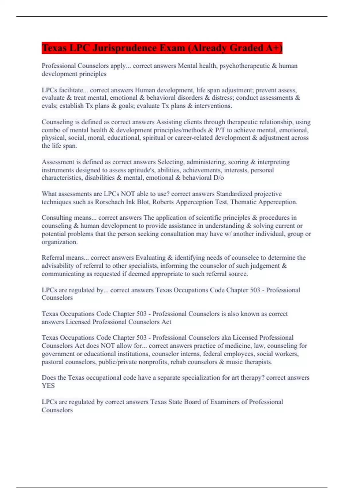 Texas LPC Jurisprudence Exam (Already Graded A+) All exams combined
