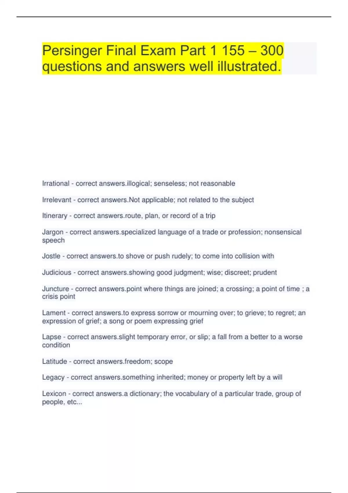 Persinger Final Exam Part 1 155 – 300 questions and answers well illustrated.Persinger Final exam words: 152-300 verified answers and questions 2023.Persinger Final Exam Review Part 1 questions and answers 100% verified and updated.Lord of the Flies Test – Persinger verified answers and questions 2023.