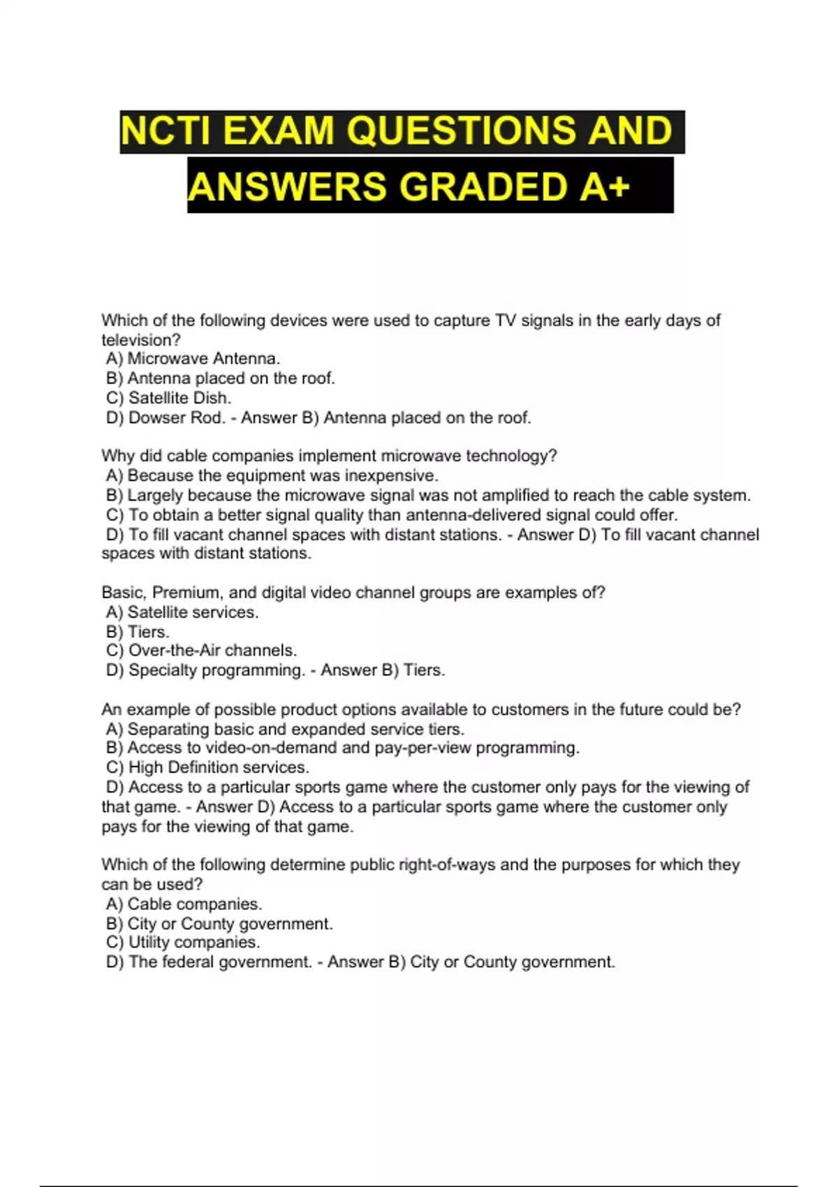NCTI FIELD TECH 2 TO 3 PROGRESSION FINAL EXAM %CORRECT ANSWERS, NCTI TECH 4 TO 5 CH. TEST STUDY GUIDE /80 QUESTIONS AND ANSWERS (A+) & NCTI EXAM QUESTIONS AND ANSWERS GRADED A+.