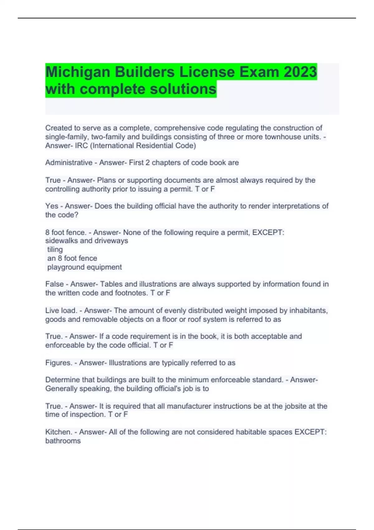Michigan Builders License Exam 2023 with complete solutions Michigan Builders Exam 2023 Questions and Answers Michigan Builders Exam with complete solutions Michigan Builders Business/Law/Accounting Exam with complete solutions Michigan Builder 2 Residential Contractors License Study Exam MICHIGAN ROOFING EXAM PREP QUESTIONS AND ANSWERS 2023