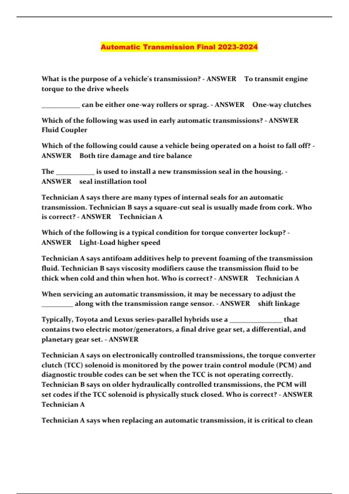 Servicing the Automatic Transmission/Transaxle Final Exam