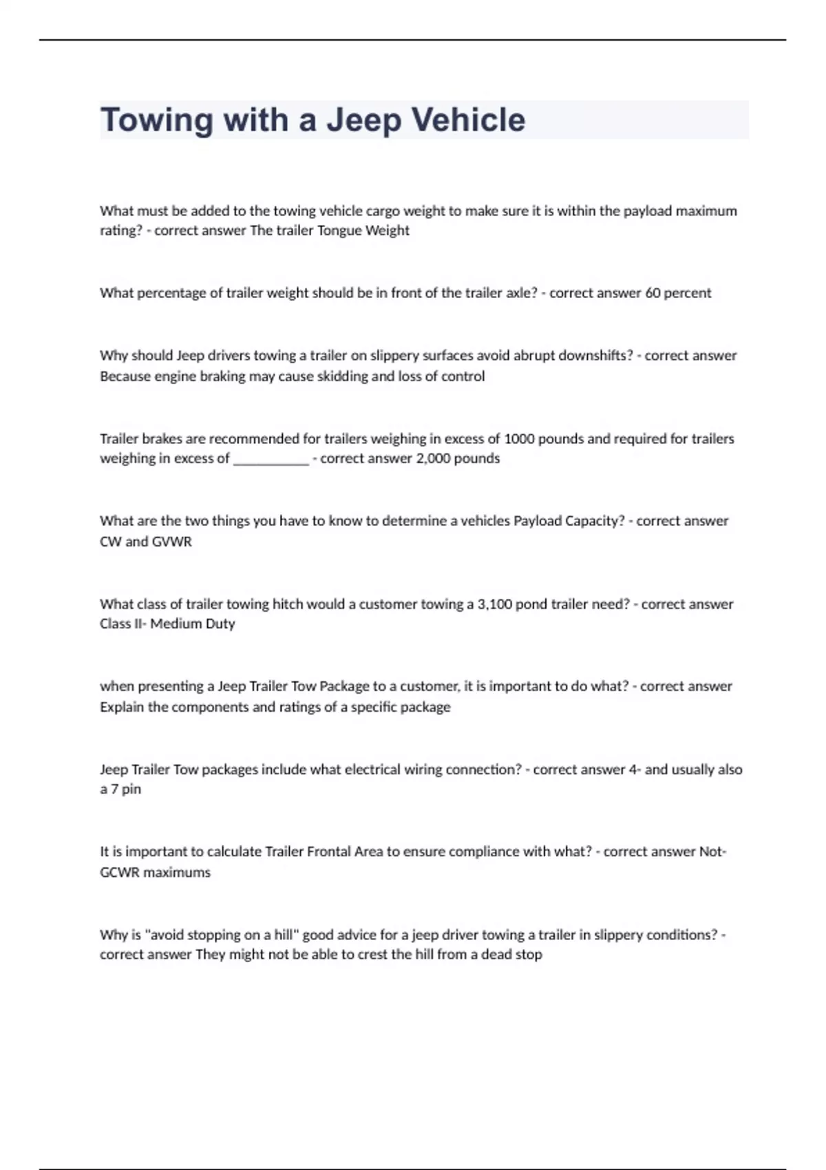 Towing with a Jeep Vehicle question with complete solution 2023