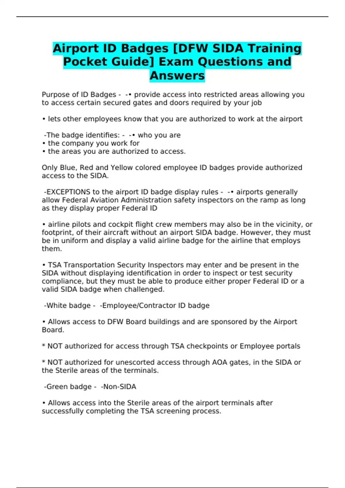 Airport ID Badges [DFW SIDA Training Pocket Guide] Exam Questions and Answers