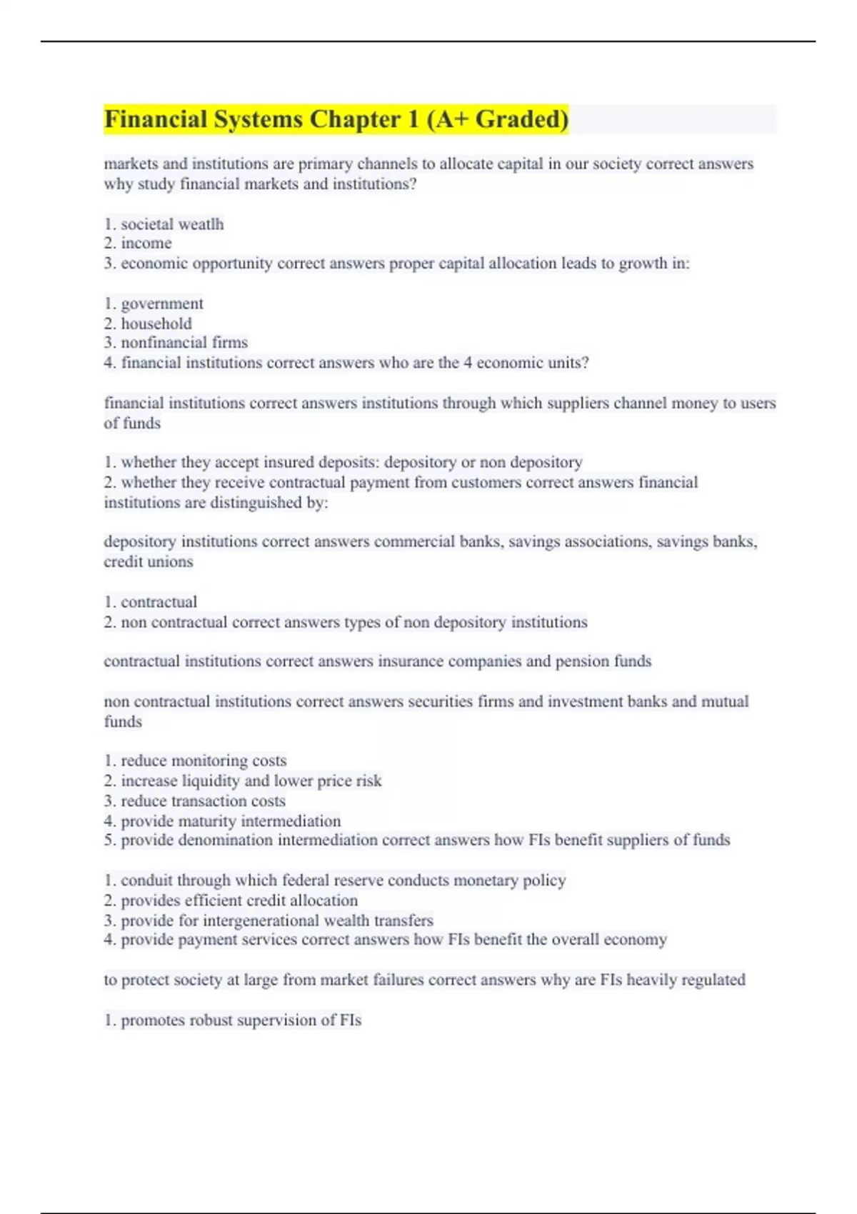 Financial systems and the Financial Market (Questions & Answers) FBLA Banking and Financial Systems (A+ Guaranteed)Chapter 1: Financial Systems and the Financial Market (All Accurately Solved) Banking and Financial Systems (with Complete Solutions) Financial Systems Chapter 1 (A+ Graded)