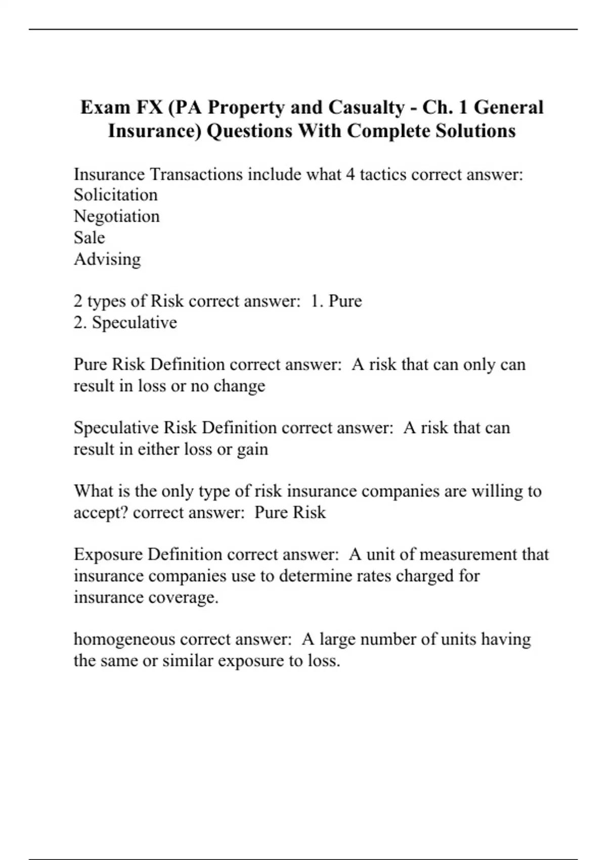 Exam FX (PA Property and Casualty - Ch. 1 General Insurance) Questions With Complete Solutions
