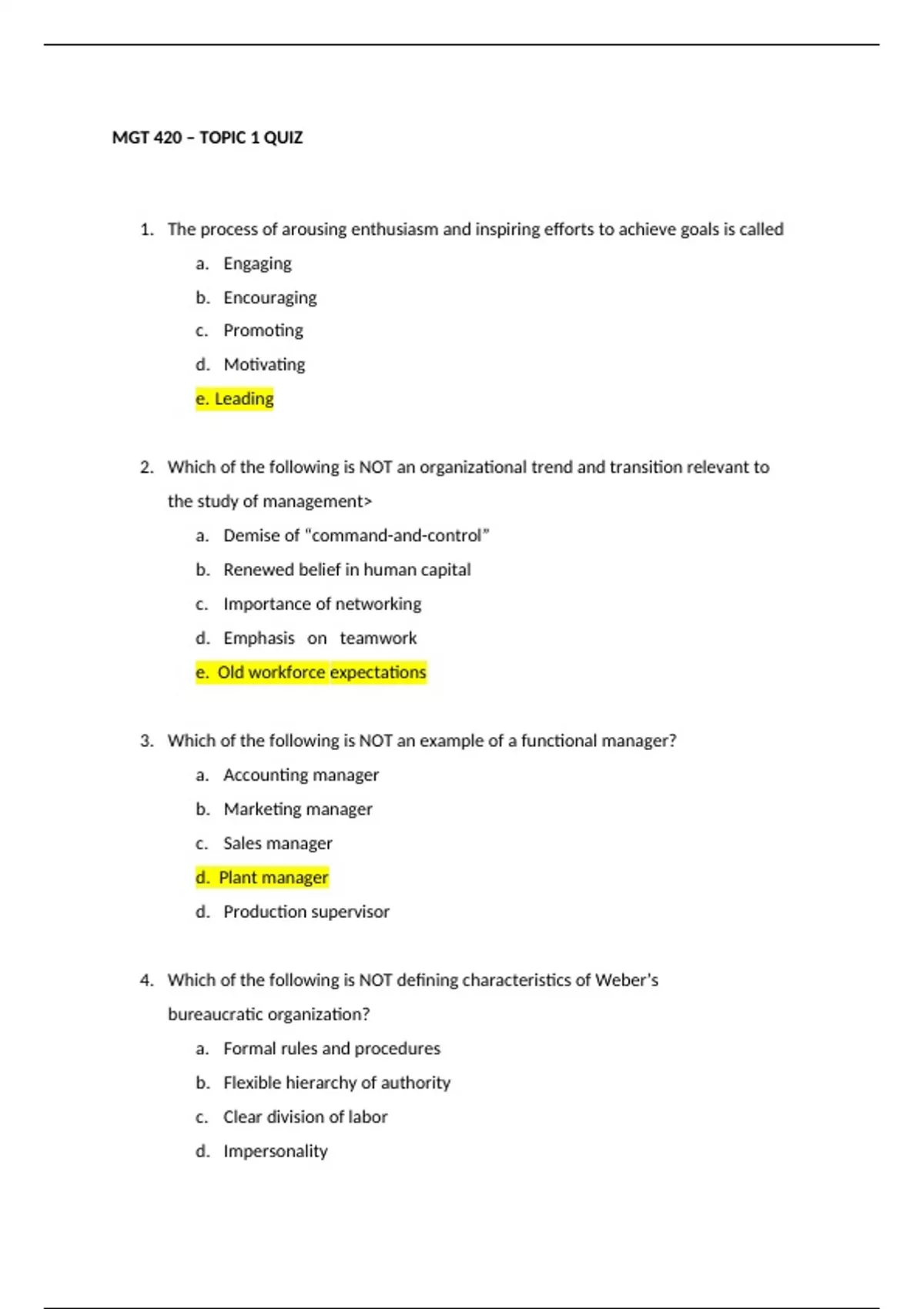 MGT 420 Topic 1 Quiz plus Quiz Study Guide