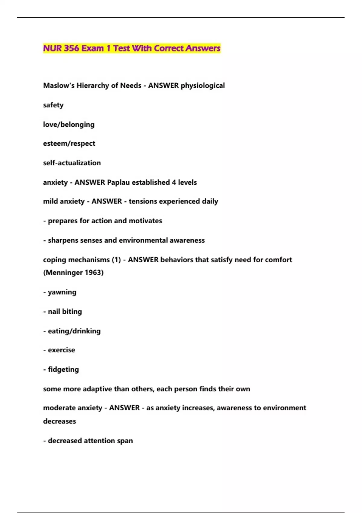 NUR 356 Exam 1 Test With Correct Answers