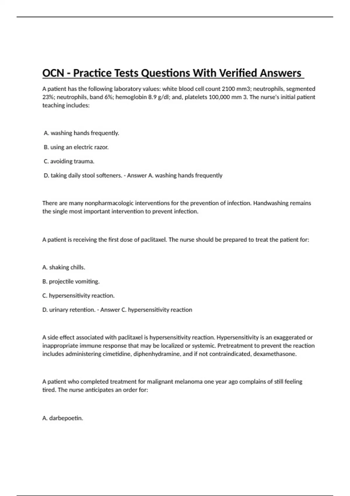 OCN - Practice Tests, OCN Practice Test, OCN Practice Tests Review, OCN Practice Questions, OCN practice Test, Oncologic Emergencies, OCN Exam Review 2023, Care Continuum, OCN Practice Questions, OCN Study Guide, OCN Chemo Review, ONCC Practice Tests (OCN Treatment Modalities, OCN EXAM 3, OCN Practice 1 Questions & Answers Graded A