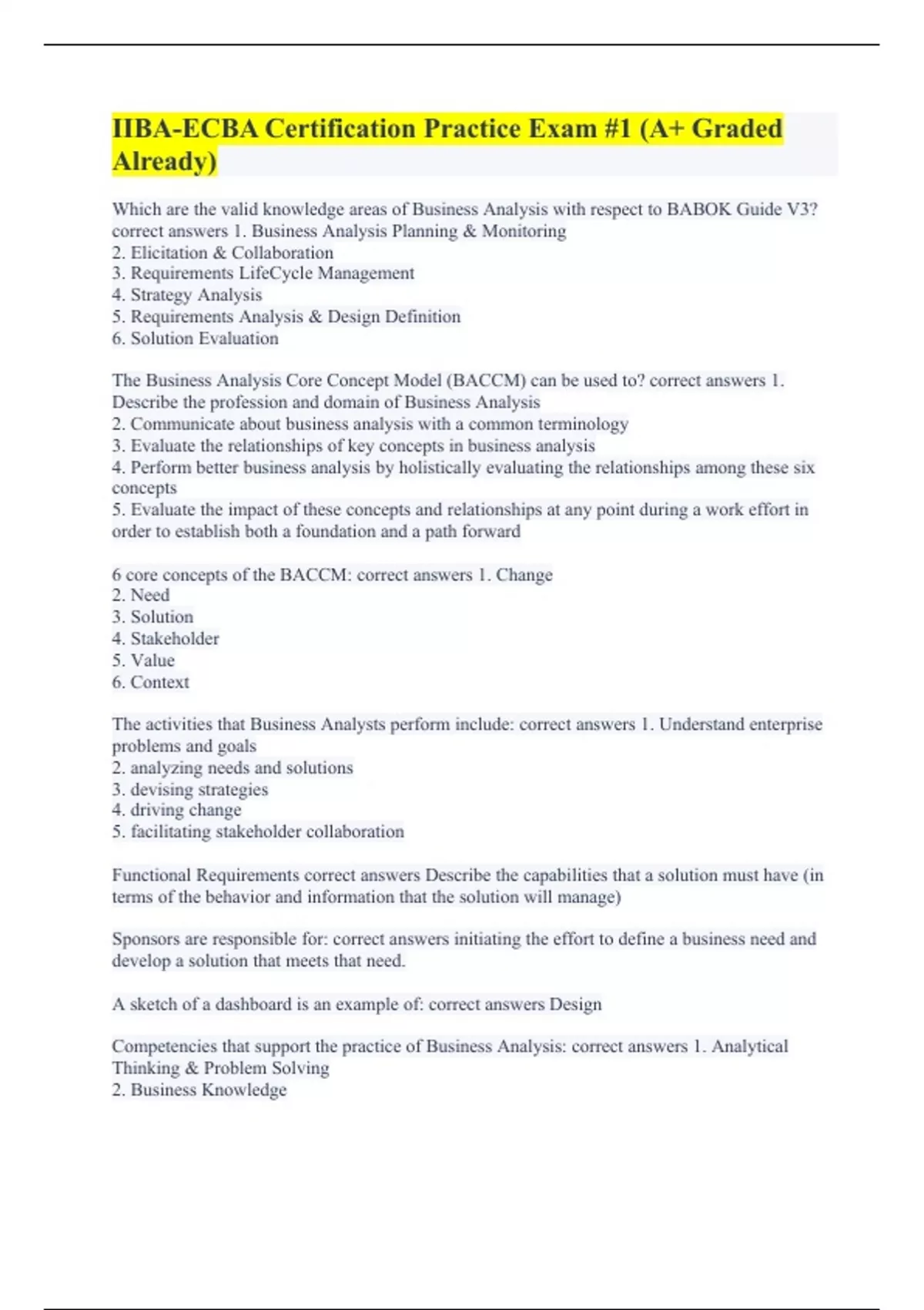 IIBA-ECBA Certification Practice Exam #1 (A+ Graded Already) ECBA practice exam (A+ Graded Already) ECBA Exam Questions (100% Errorless Answers) ECBA Key Terms (All Correct) IIBA-ECBA Study Guide Techniques - Chapter 6 (Strategy Analysis) with Complete Solutions. IIBA - ECBA Test Bank Questions #2 (100% Correct Answers) IIBA-ECBA Study Guide Unders