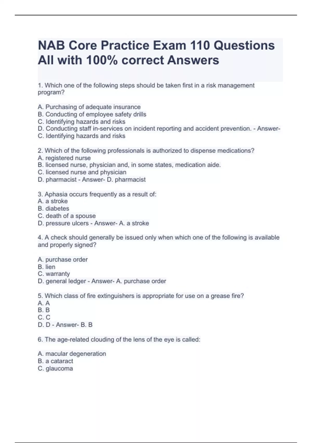 NAB Core Practice Exam 110 Questions All with 100% correct Answers NAB CORE Practice Exam with correct Answers 2023 NAB Core Exam 2023 Questions with correct Answers CORE-NAB EXAM 2023 Questions and Answers NAB Exam- Everything that is needed to know Questions and Answers NAB NHA and CORE Exam NAB CORE RCAL-LEADERSHIP EXAM WITH CORRECT ANSWERS