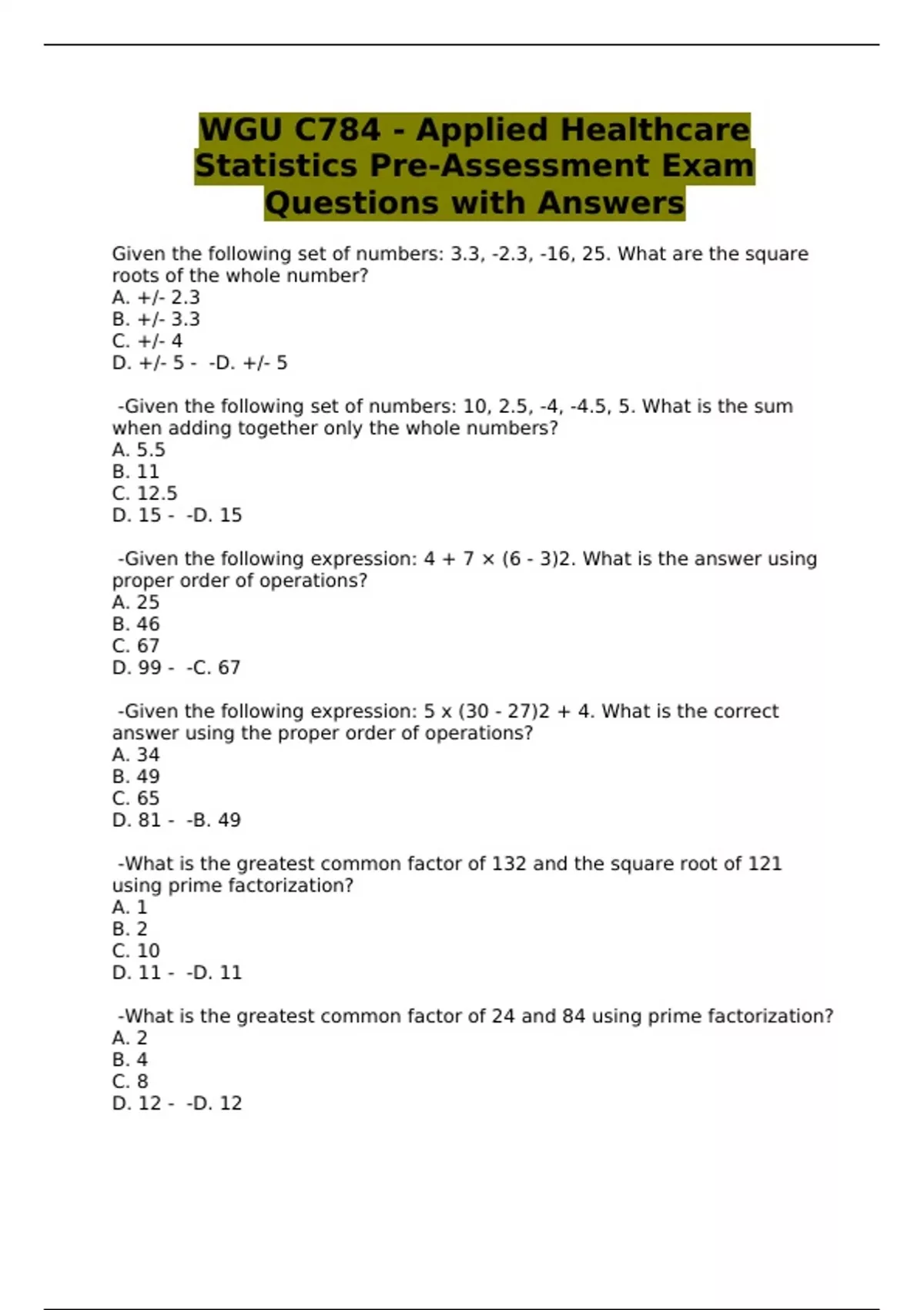 WGU C784 - Applied Healthcare Statistics Pre-Assessment Exam Questions with Answers