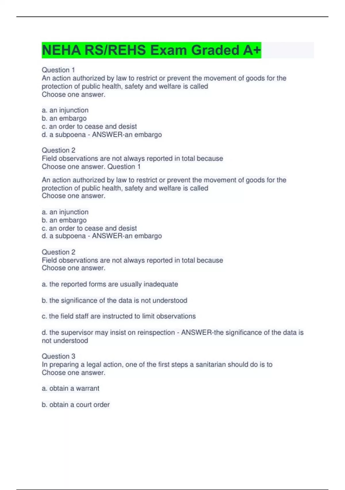 NEHA RS/REHS Exam Graded A+ REHS NEHA Exam 2023 Solved 100% REHS Exam 2023 360 Answered Questions NEHA REHS/RS Exam - Practice Questions and Answers 100% Correct REHS 2023/24 Exam: Bloodborne Pathogens REHS 300 questions solved 100% correct REHS- Wastewater treatment and Disposal Quiz latest updated graded A+ REHS Exam2023- Milk and Dairy Products