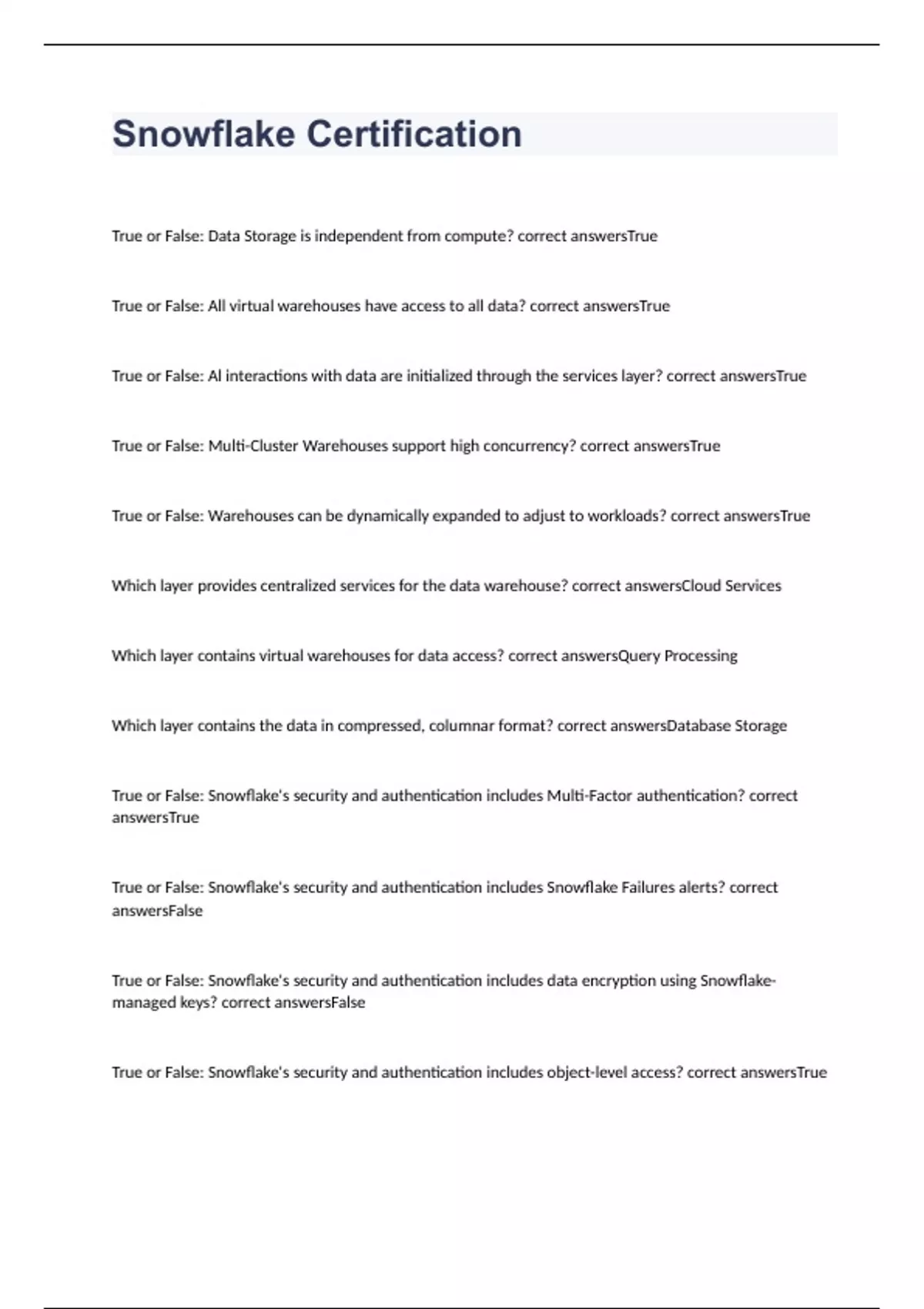 Snowflake Certification exam 2023 with 100% correct answers Snowflake Certification Cheat Sheet exam 2023 with 100% correct answers