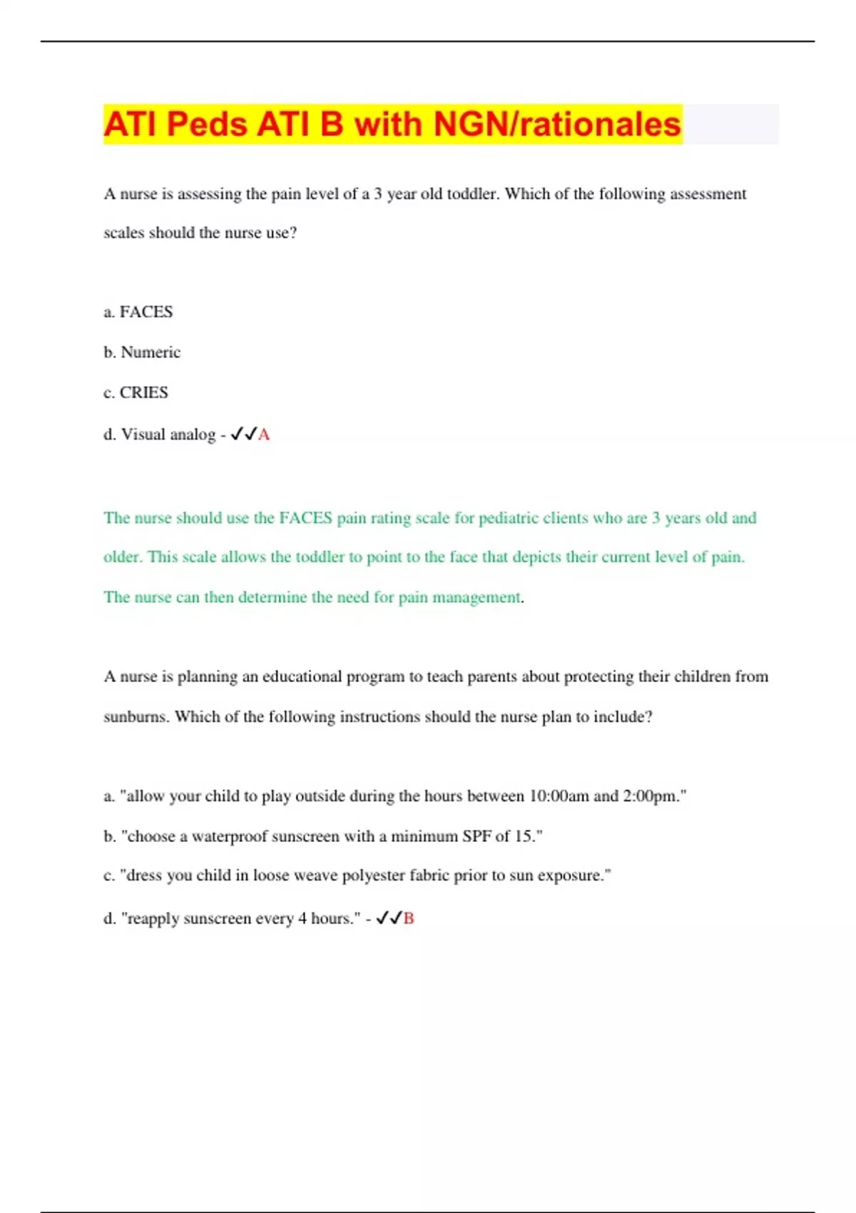 ATI Peds ATI B with NGN/rationales 2023 | 100% Correct Answers | Updated & Verified