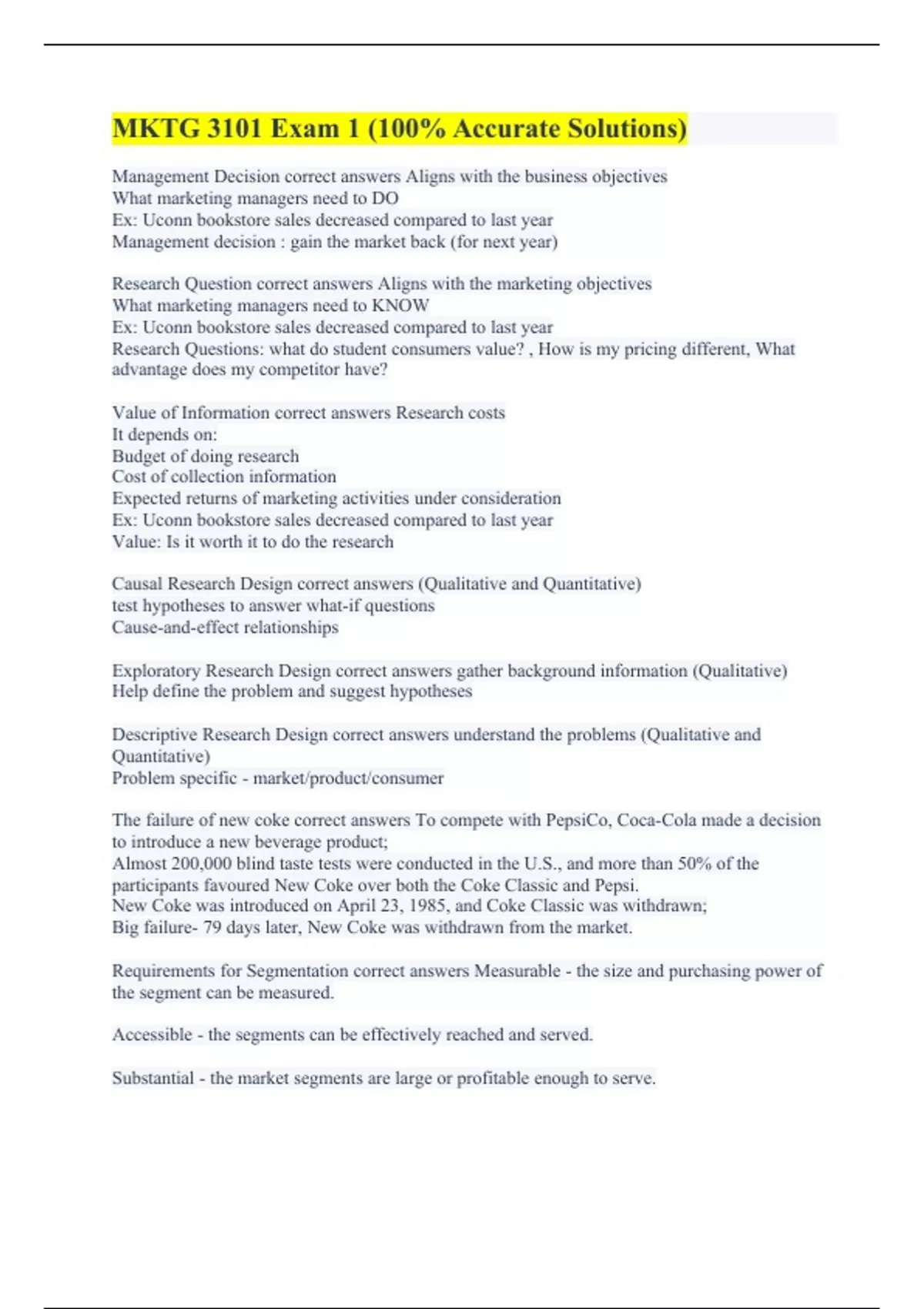 MKTG 3101 Final Exam (100% Errorless Answers) MKTG 3101 Exam 1 (100% Accurate Solutions) Marketing 3101 - Exam 1 (100% Correct Answers) MKTG 3101 FINAL UCONN (100% VERIFIED SOLUTIONS) MKTG 3101 Midterm UConn (All Correct 100%) MKTG 3101 FINAL EXAM (A+ GRADED)