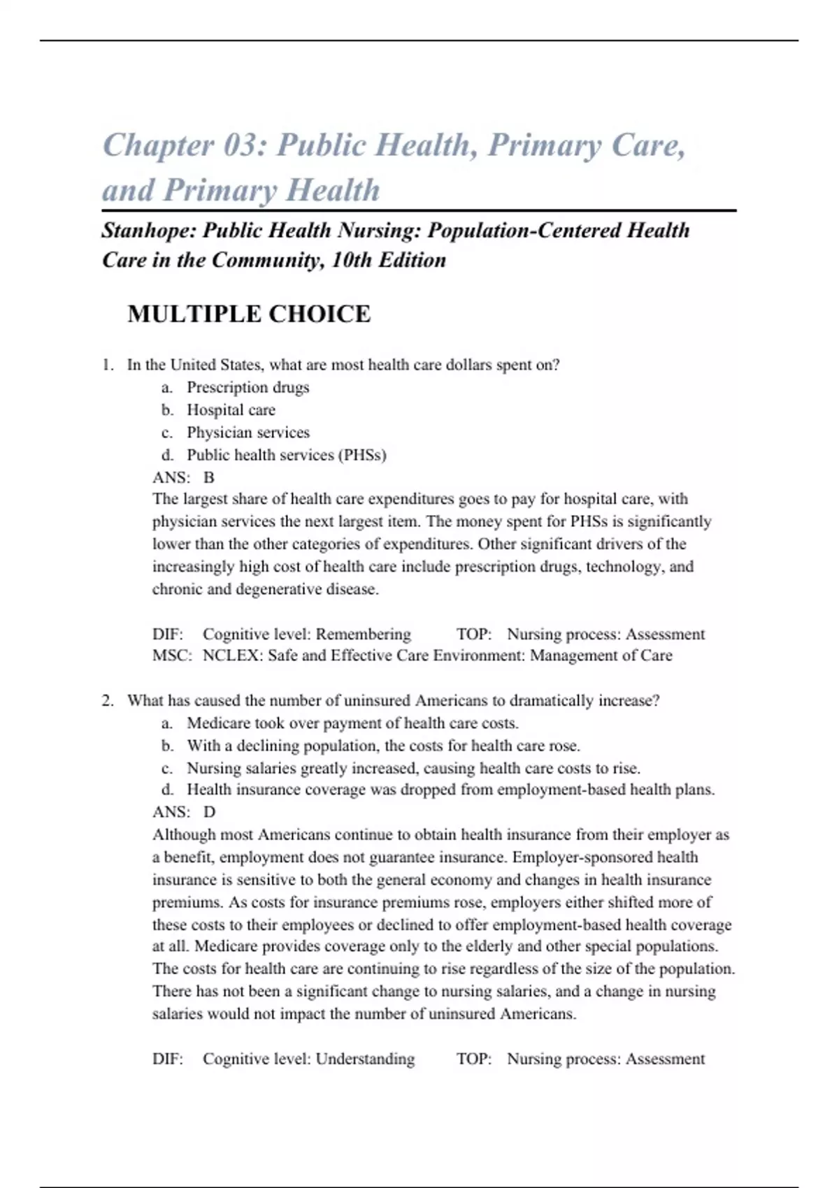Chapter 03: Public Health, Primary Care, and Primary Health Stanhope: Public Health Nursing: Population-Centered Health Care in the Community, 10th Edition