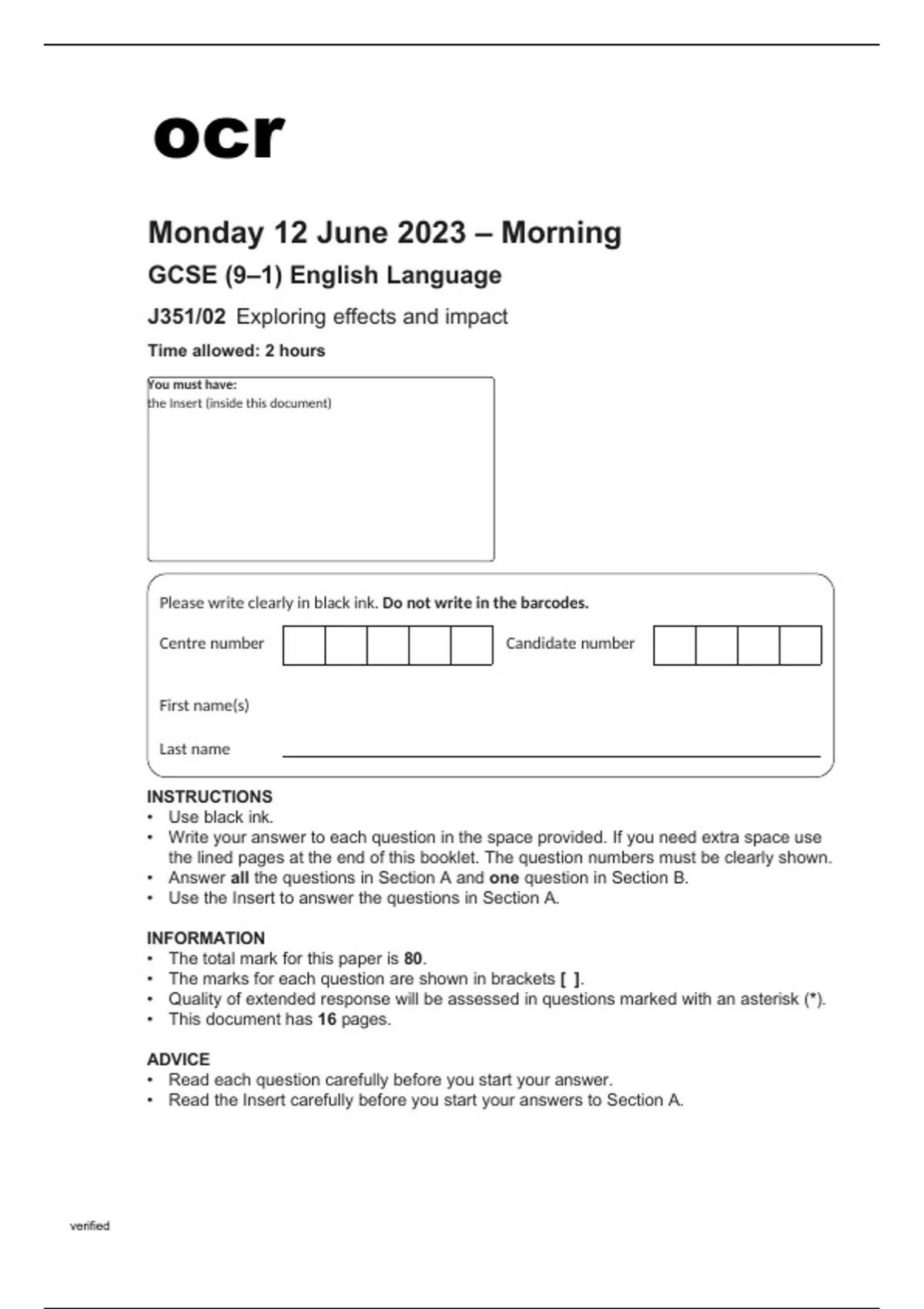 ocr GCSE English Language (J351/02) QUESTION PAPER AND MARK SCHEME June2023. ocr GCSE English Language (J351/02) MARK SCHEME June2023. ocr GCSE English Language (J351/02) QUESTION PAPER June2023. (J351/02) QP AND MS