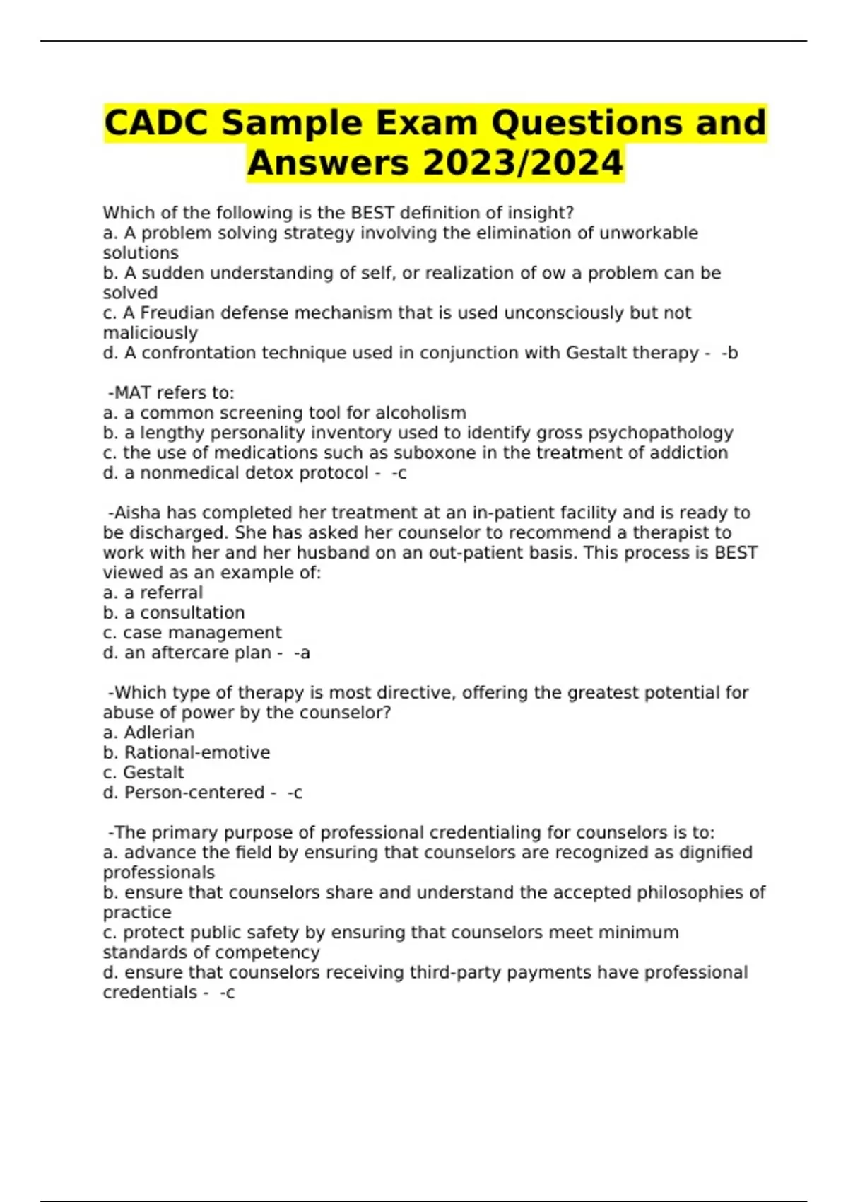 CADC: Practice Exam #1 Questions and Answers Distinction Graded