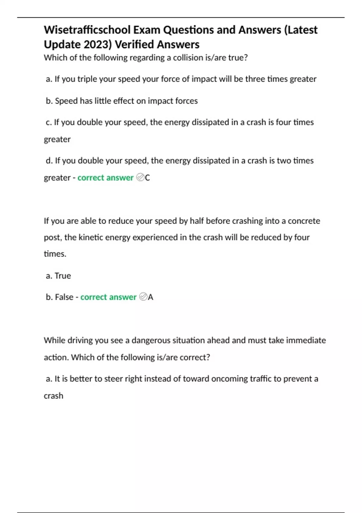 Florida Drug and Alcohol Traffic Awareness or the Florida TSLAE (Exam Questions Answered) 2023 Update 2 Exam (elaborations) Traffic School Online Final Exam 25 Question and Answers (Verified Solutions) 3 OTHER Traffic School Section 2 Exam Questions and Answers (Latest Update 2023) Verified Solutions 4 Exam (elaborations) Florida Traffic School
