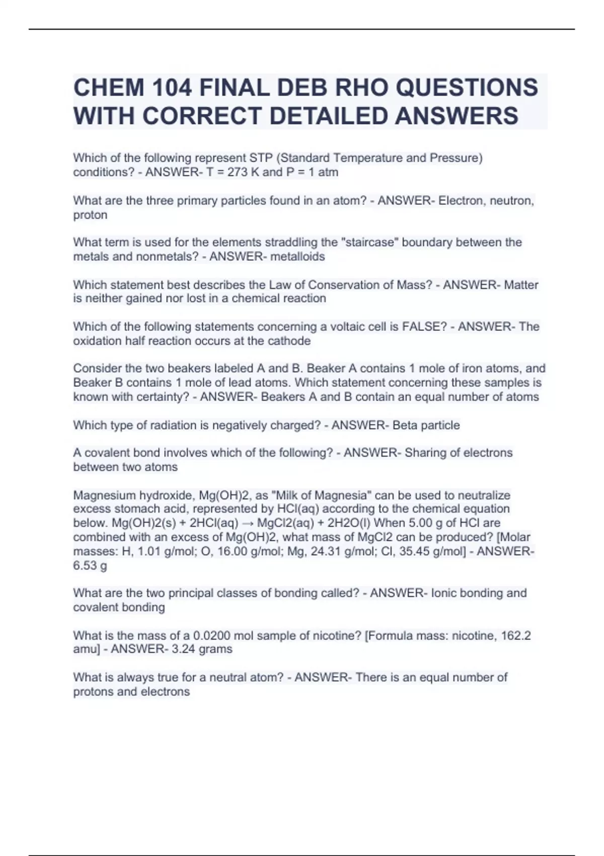 CHEM 104 UW MADISON EXAM 1 2023 QUESTIONS WITH CORRECT DETAILED ANSWERS CHEM 104 EXAM 3 QUESTIONS WITH CIRRECT DETAILED ASNSWERS 2023 CHEM 104 EXAM 1 MATERIAL QUIZZES WITH ANSWERS 2023/2024 CHEMISTRY 104 EXAM 1 QUESTIONS WITH CORRECT ANSWERS 2023 CHEMISTRY 104 - FINAL EXAM REVIEW NOTECARDS QUIZZES AND ANSWERS CHEM 104 FINAL EXAM QUESTIONS WIT