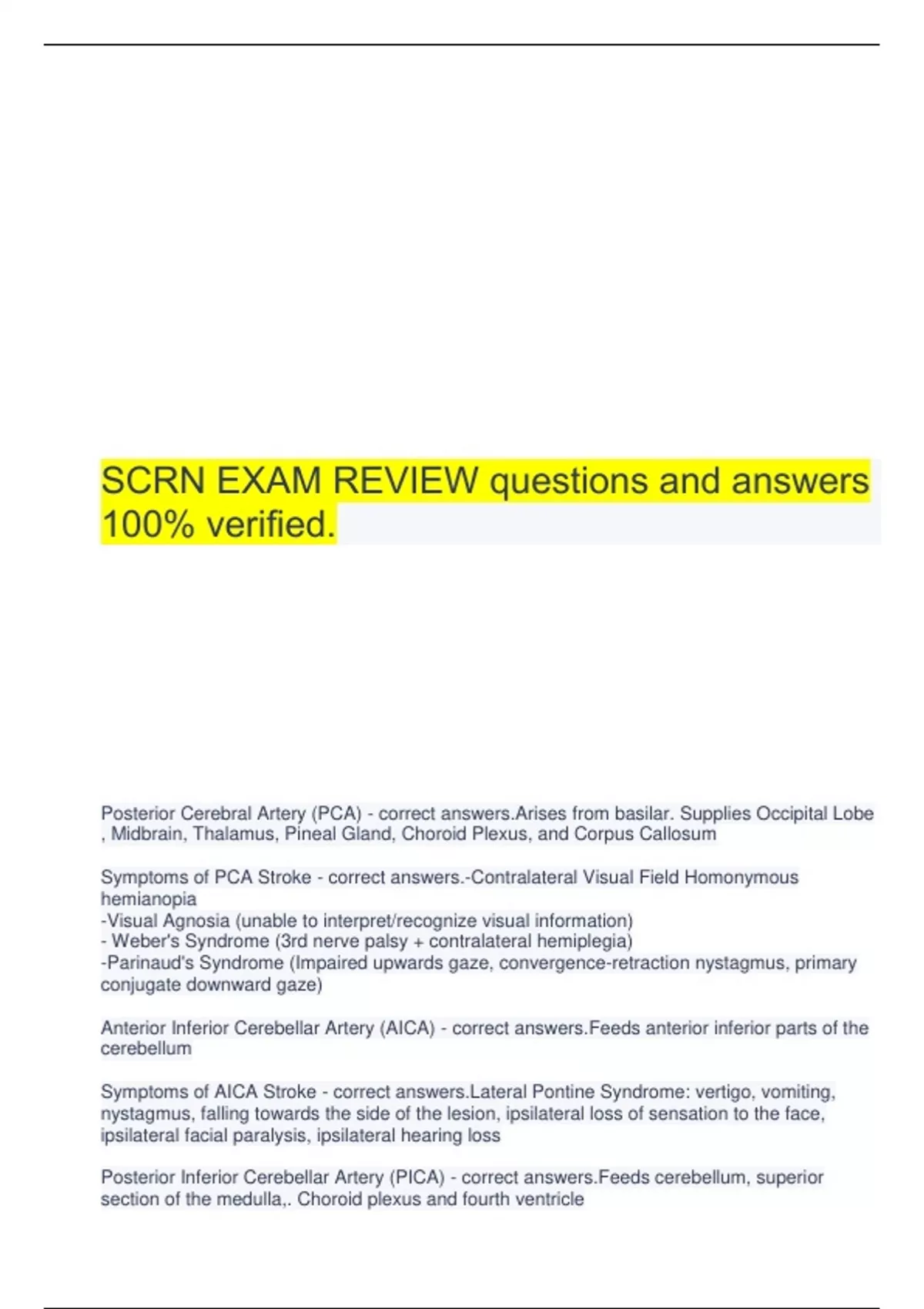 SCRN bundled Exam Review ( Stroke Syndromes) questions with complete solutions.