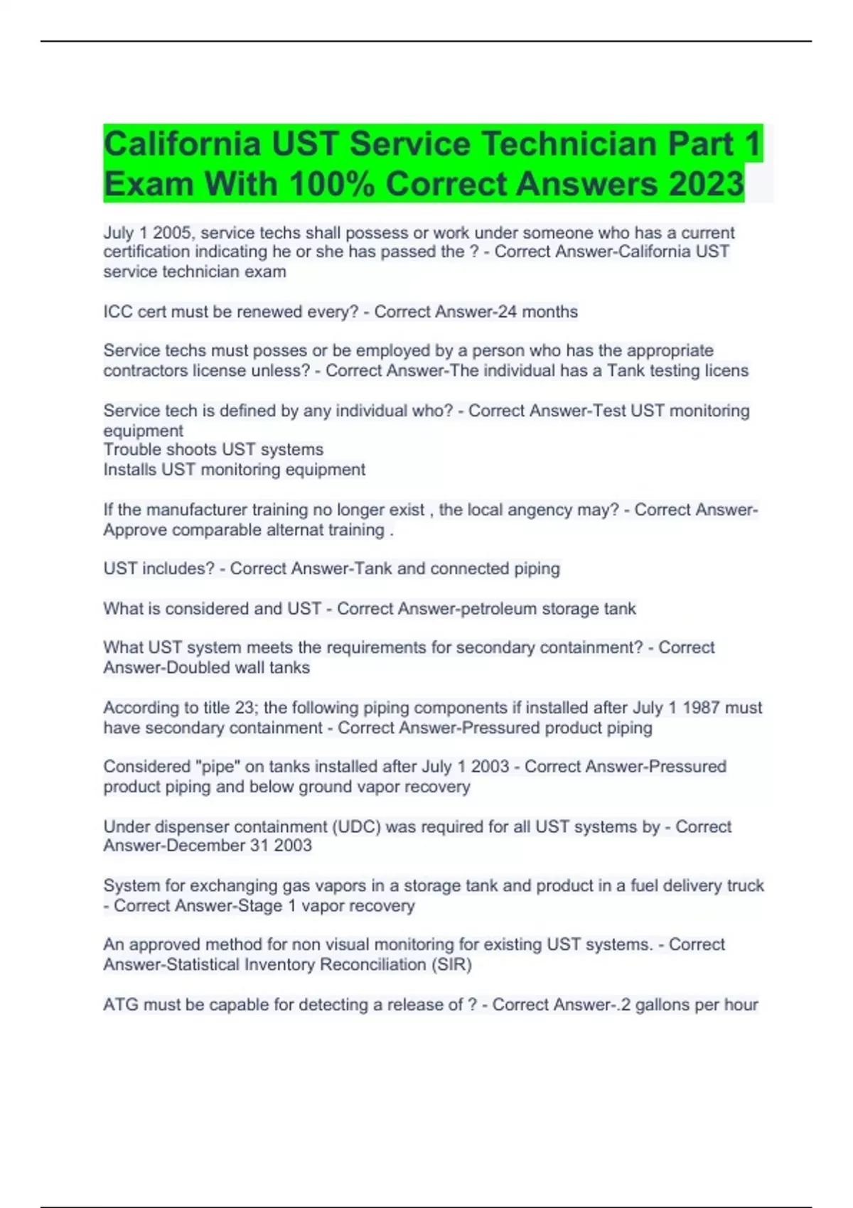U3 ICC Tank Tightness Testing exam Questions with 100% Correct Answers | Verified ICC Decommissioning (U2) Questions And Answers 2023 California UST Practice Test 1 Exam with 100% Correct Answers 2023 Underground Storage Tanks Exam Questions With 100% Correct Answers 2023 Underground Storage Tanks Exam With 100% Correct Answers 2023