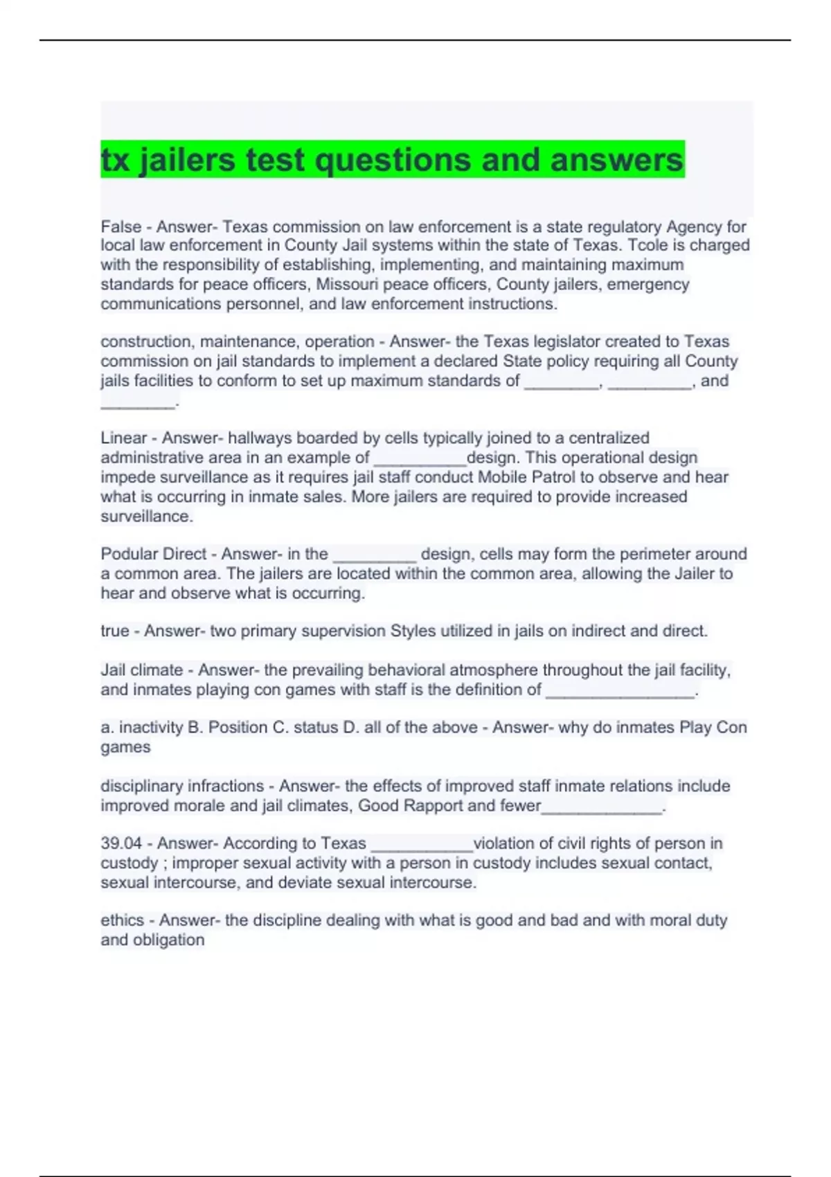 tx jailers test questions and answers 2023/2024 2 Exam (elaborations) Texas Jailers Course - Test 1 (History & Jail Concepts) Questions and Answers-Graded A 3 Exam (elaborations) TCOLE STATE TEST FINAL EXAM 2023 4 Exam (elaborations) TCOLE practice test BCOC Questions with correct Answers-Graded A 5 Exam (elaborations) TCOLE Practice Jailer exa