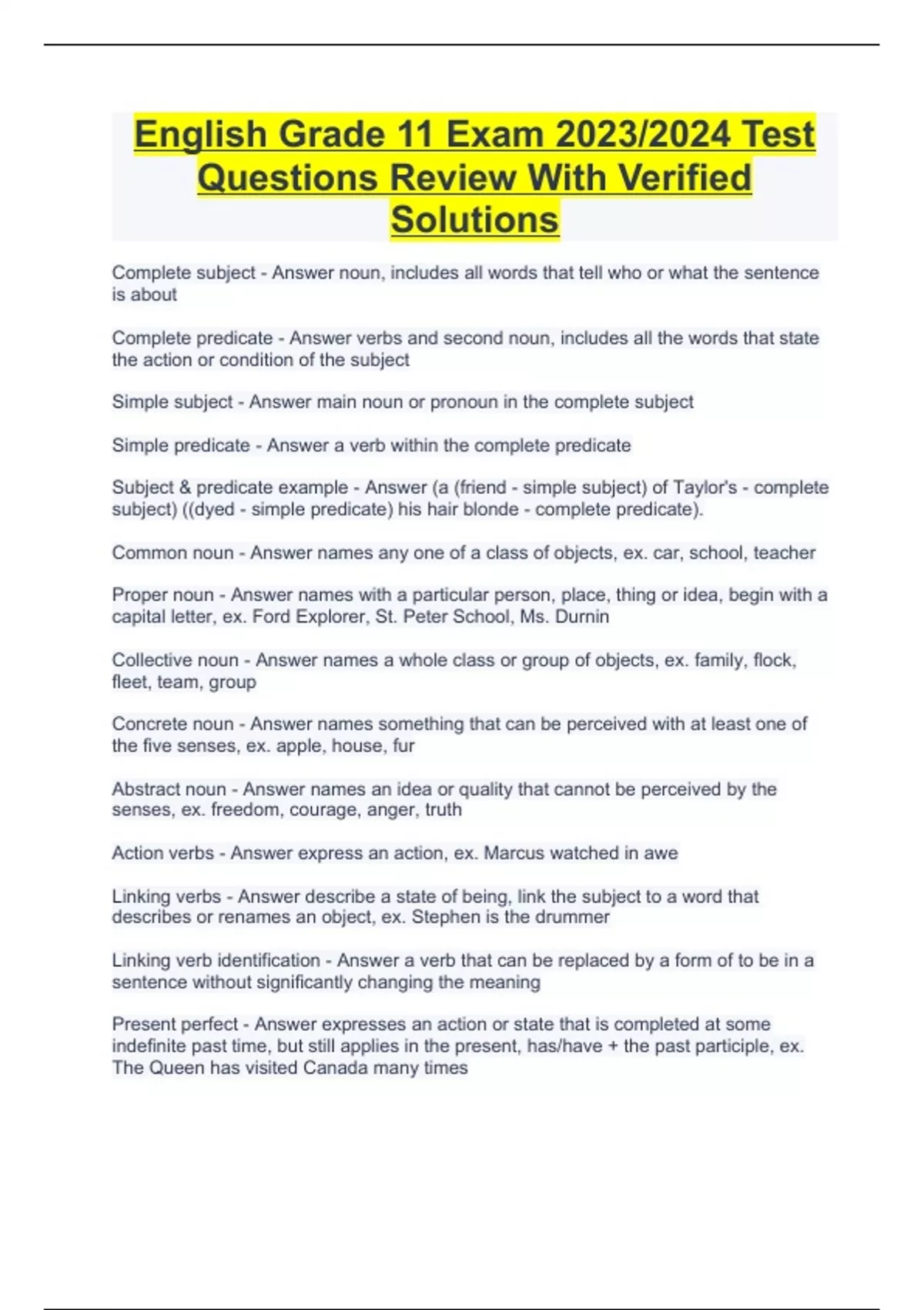 English Grade 11 Exam 2023/2024 Test Questions Review With Verified Solutions