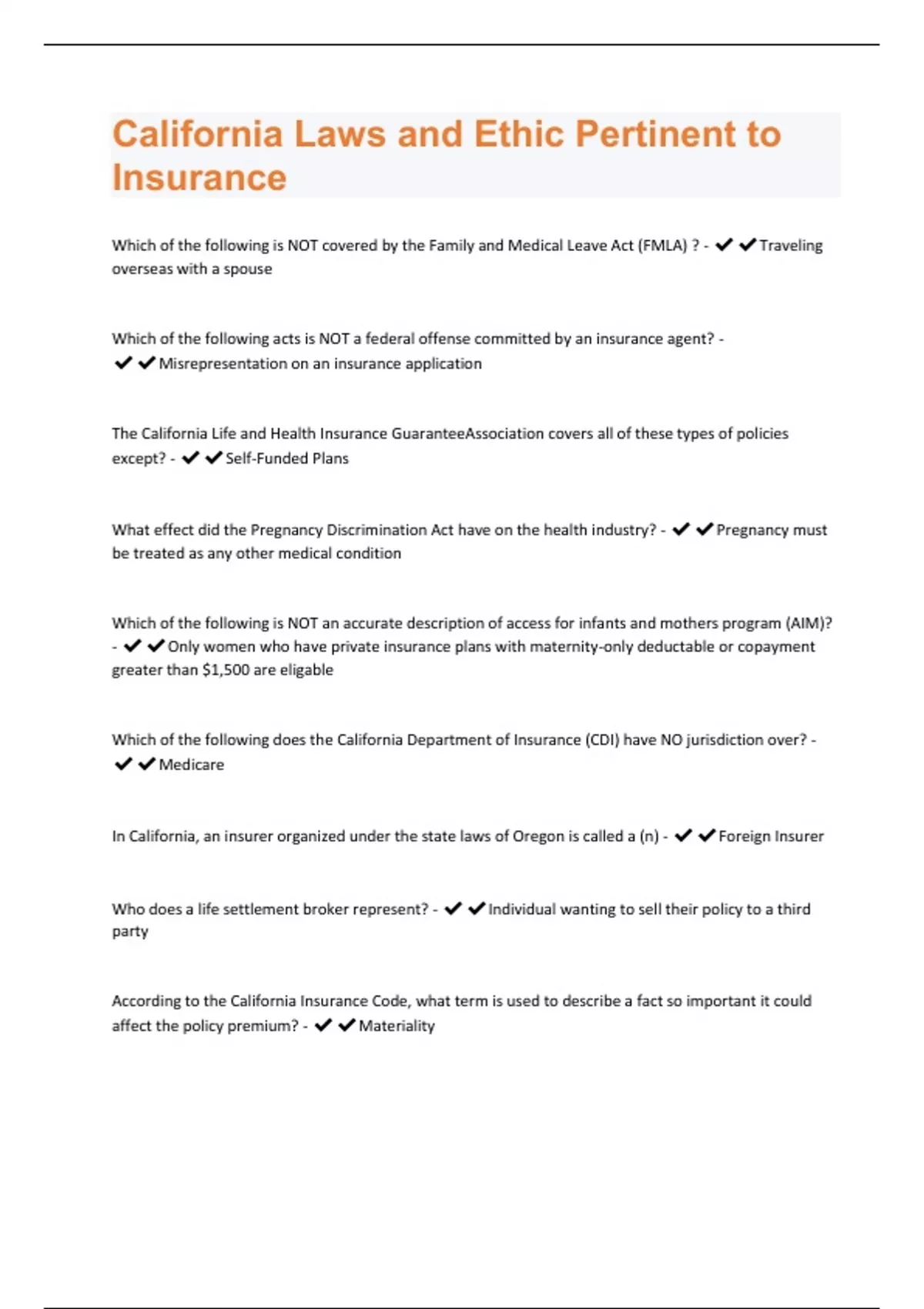 California Laws and Ethics Pertinent to Insurance Questions With Complete Correct Answers.