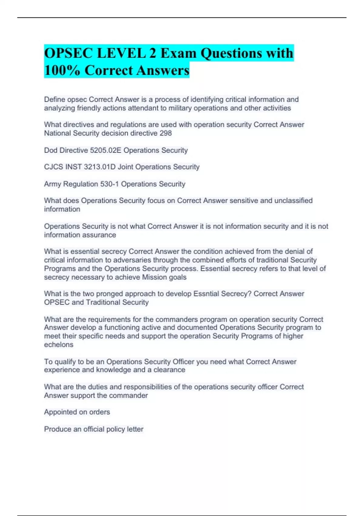 OPSEC LEVEL 2 Exam Questions with 100% Correct Answers Operations Security (OPSEC) Annual Refresher Course Questions with 100% Correct Answers Army OPSEC 020-G100 Exam Questions with 100% Correct Answers Army OPSEC Exam Questions with 100% Correct Answers OPSEC II Exam Questions with 100% Correct Answers Operational Security (OPSEC) (JKO Post Test)