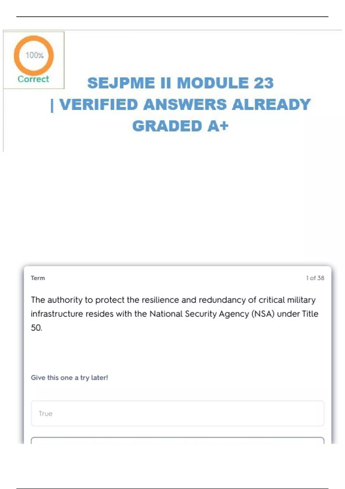 COMPLETE BUNDLE FOR SENIOR ENLISTED JOINT PROFESSIONAL MILITARY EDUCATION (SEJPME) II MODULE 1-24 QUESTIONS & ANSWERS