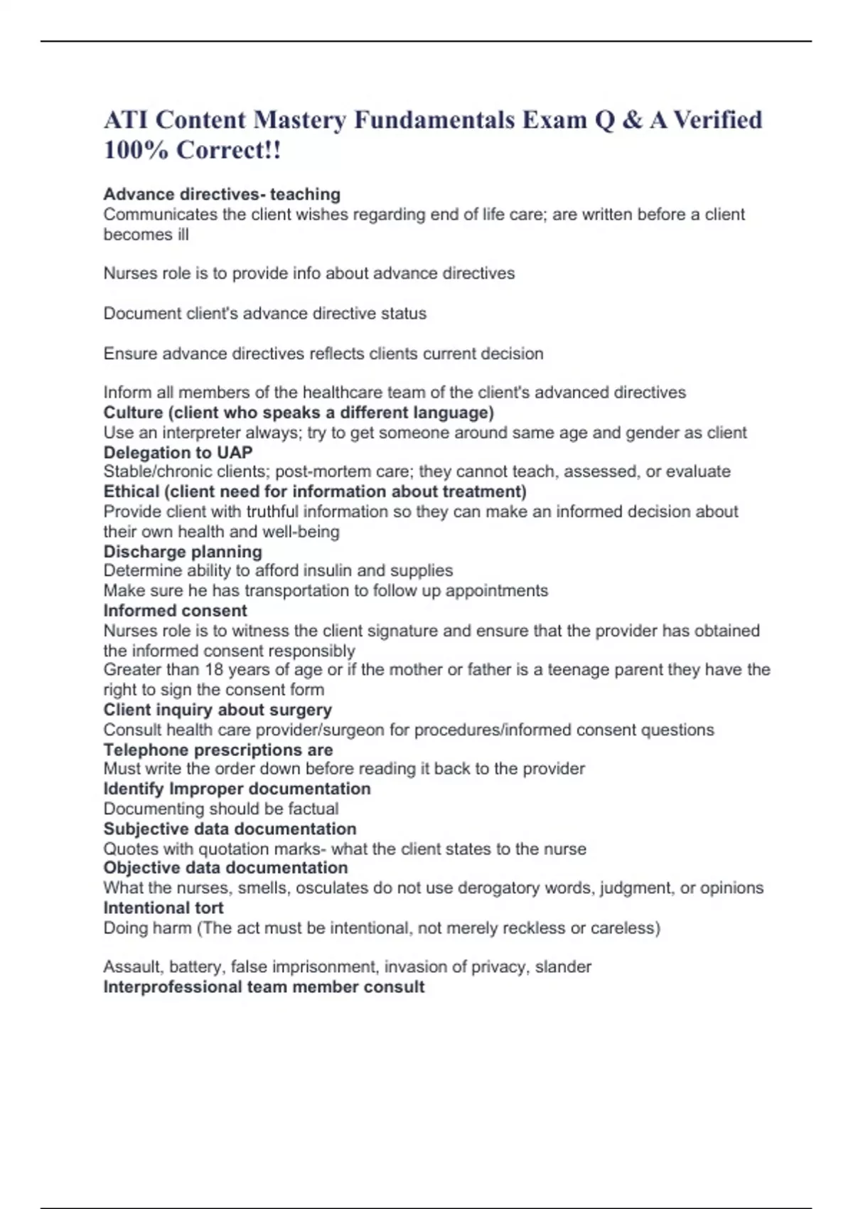 ATI Content Mastery Fundamentals Exam Q & A Verified 100% Correct!! ATI Content Mastery Exam 76 Questions With Complete Solutions. ATI Content Mastery Series : Fundamentals Quizzes & Answers. ATI Content Mastery Series (RN Concept-Based Assessment) Questions With 100% Correct Solutions. Fundamentals ATI Content Mastery Series Questions - Exam 1 (An