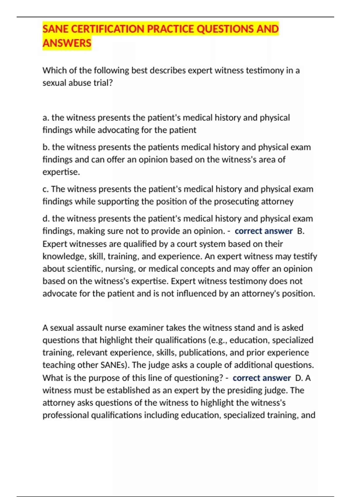 SANE ,,SERIES OF QUESTIONS AND 100% CORRECT ANSWERS