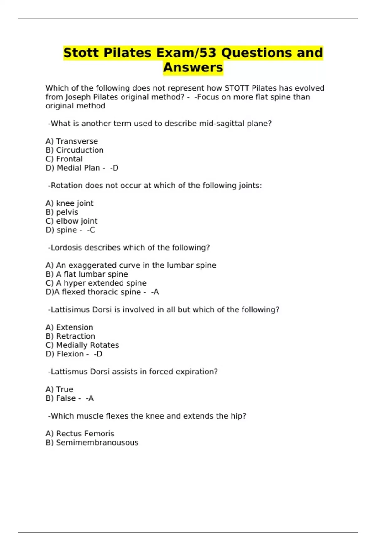 Stott Pilates Exam/53 Questions and Answers/A+ Graded
