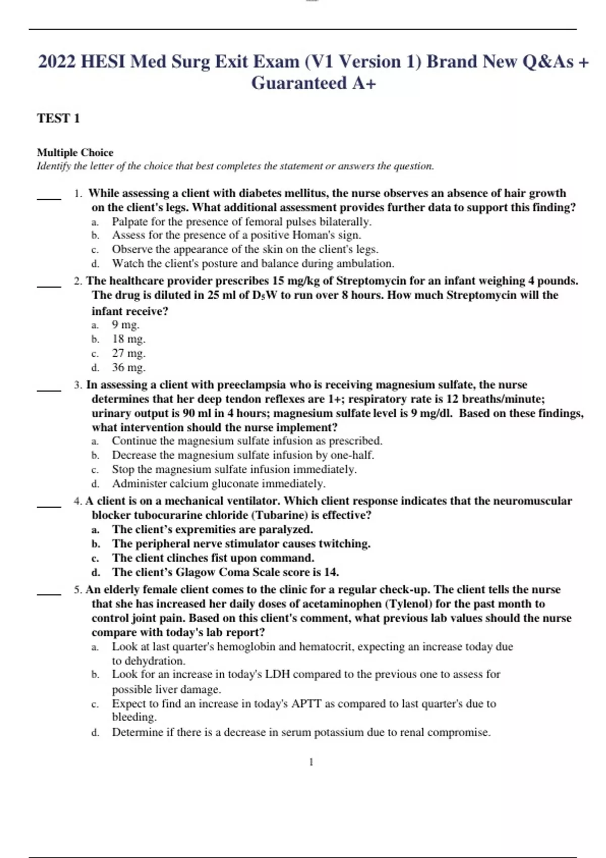 2022 HESI Med Surg Exit Exam (V1 Version 1) Brand New Q&As + GuaranteedA