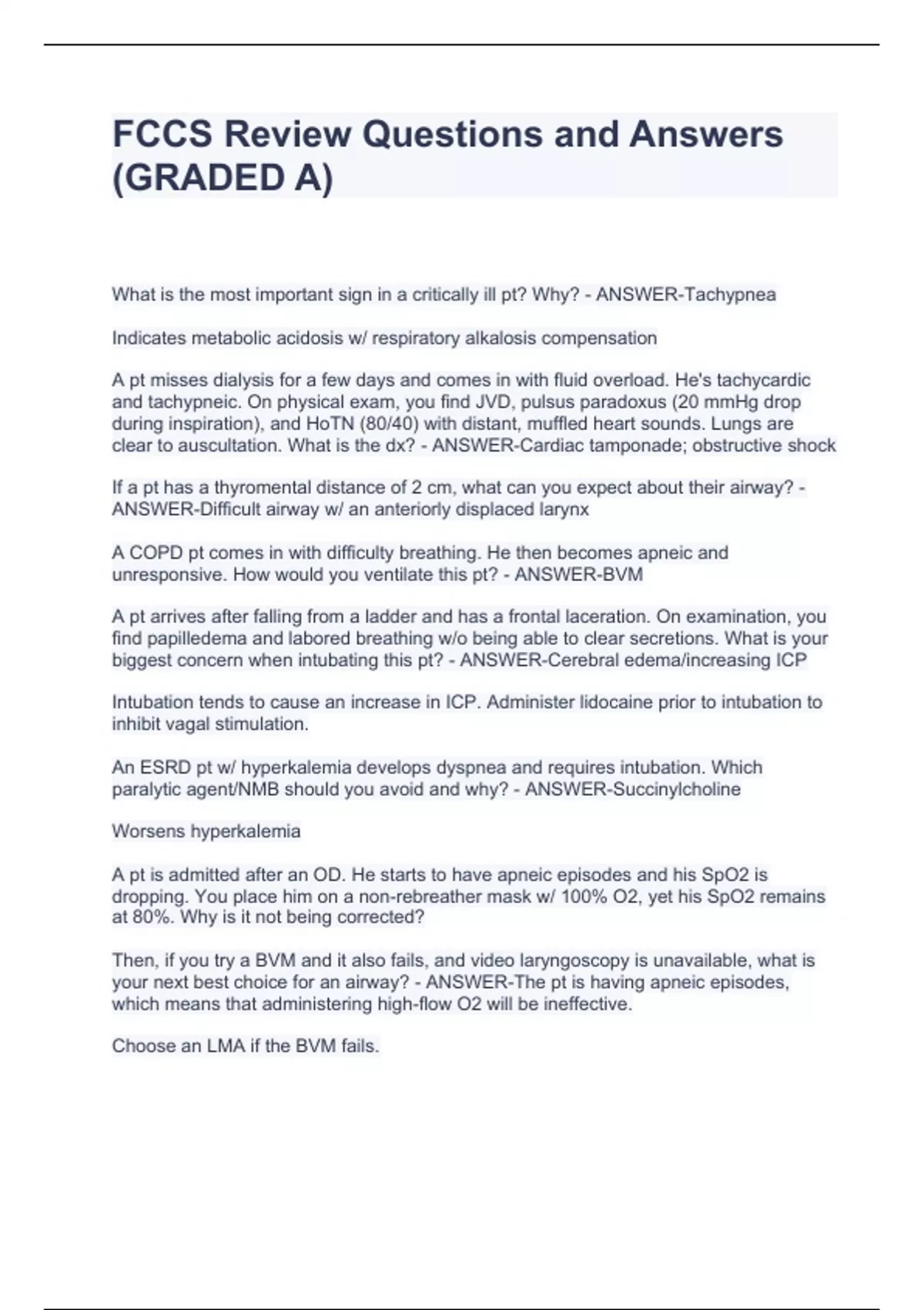 FCCS Exam Questions & Answers (Graded A)
