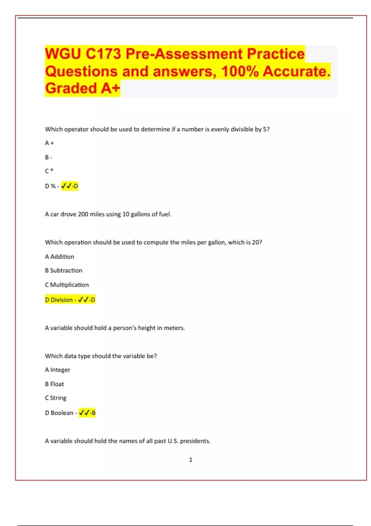 WGU C173 Pre-Assessment Practice Questions and answers, 100% Accurate. Graded A+