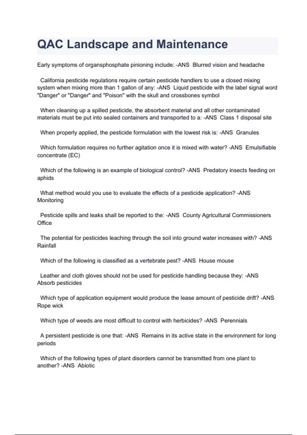 Contains QAL - Cat A Practice Questions With 100% correct answers QAL - Laws and Regulations Exam with 100% correct answers QAC Landscape and Maintenance exam 2023/2024 with 100% correct answers