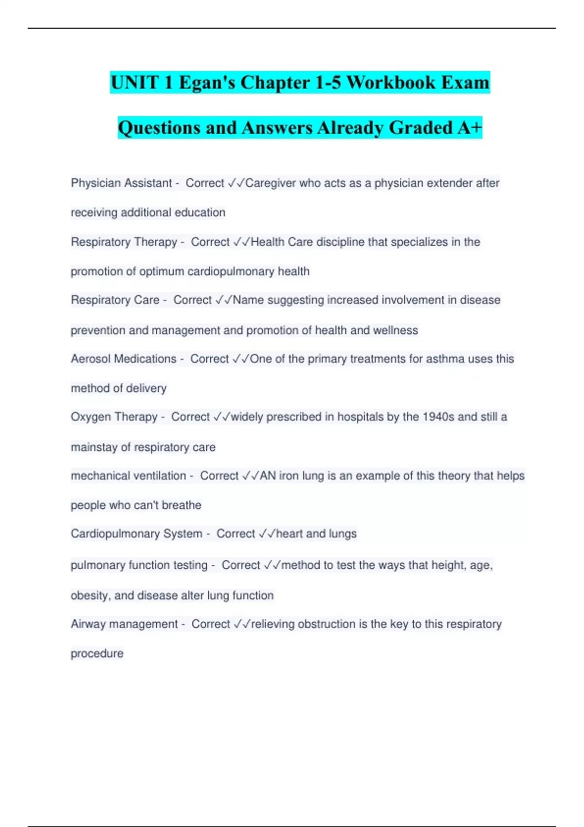 RT (Egan's) Fundamentals Ch. 5 Exam Questions and Answers Already Graded A+