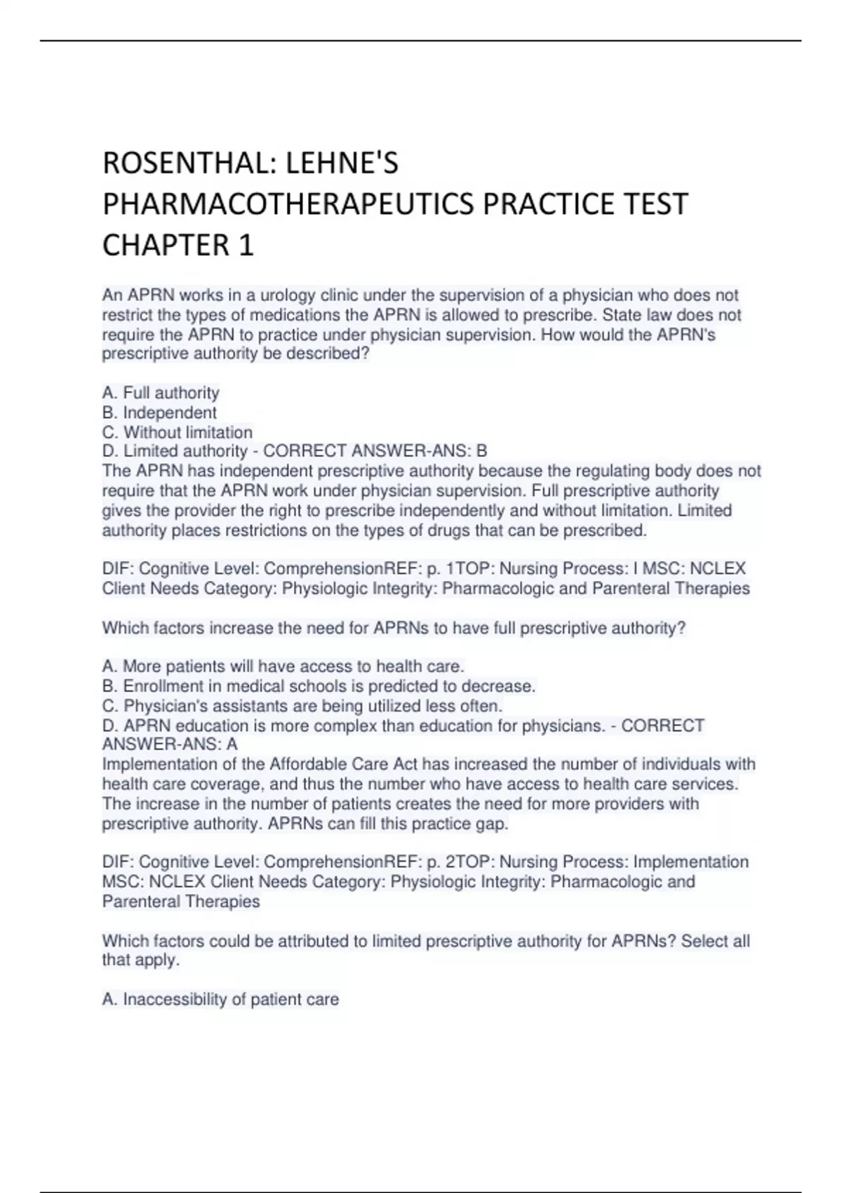 LEHNE S PHARMACOLOGY ALL CHAPTERS FULLY COVERED WITH QUESTION & CORRECT ANSWER PHARMACOTHERAPEUTICS QUESTION & CORRECT ANSWER LEHNE S PHARMACOLOGY END OF TERM EXAM LEHNE PHARMACOLOGY MIDTERM EXAM ROSENTHAL: LEHNE S PHARMACOTHERAPEUTICS PRACTICE TEST CHAPTER 1 Pharm TEST 2