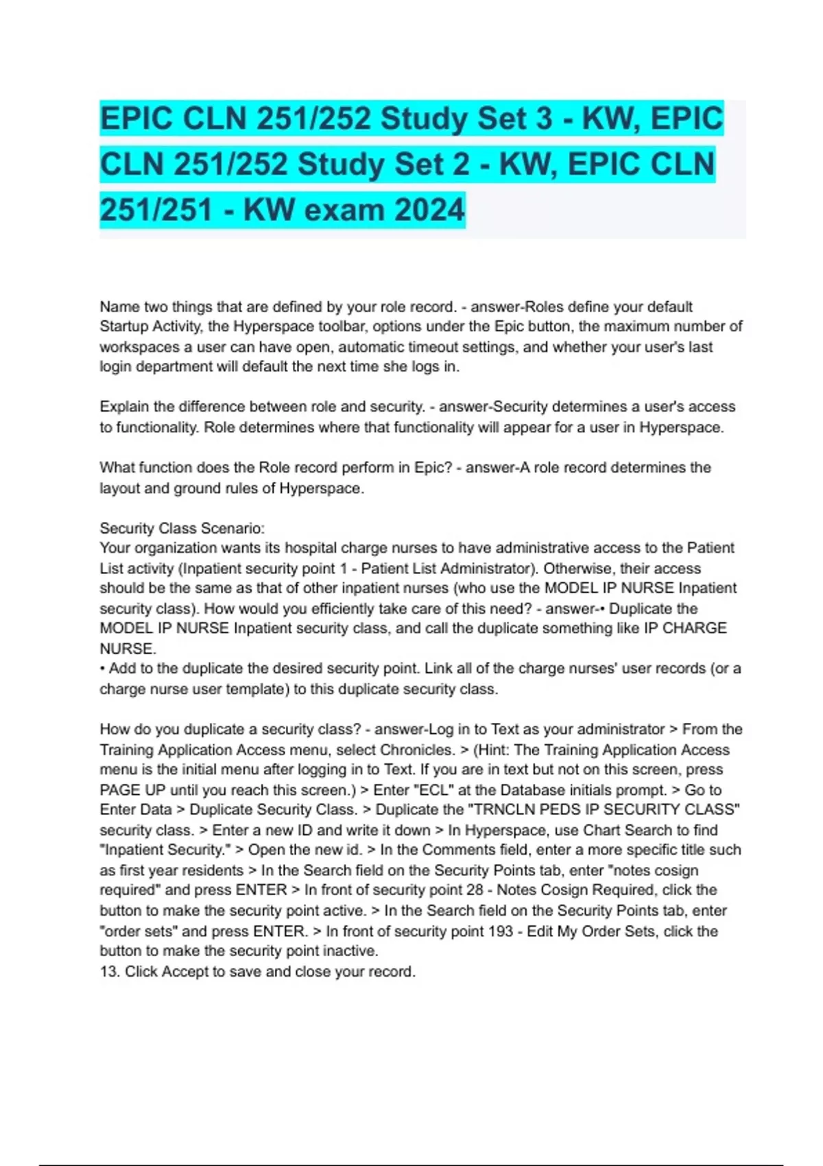 EPIC CLN 251/252 Study Set 3 - KW, EPIC CLN 251/252 Study Set 2 - KW, EPIC CLN 251/251 - KW exam 2024