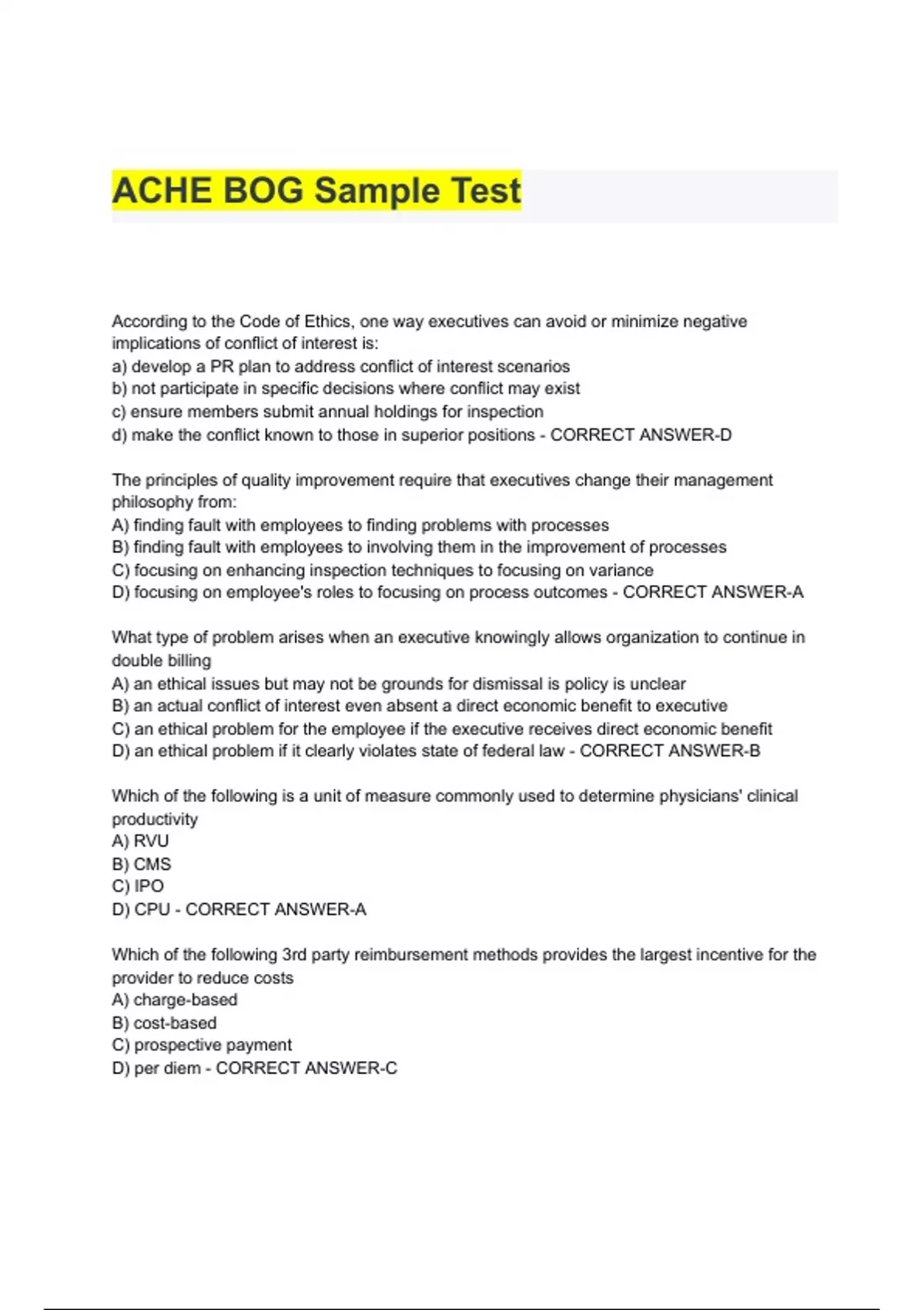 Past Questions From ACHE's Board of Governors Exam CORRECTLY ANSWERED