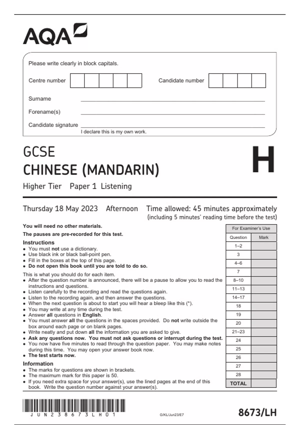 GCSE AQA May 2023 Higher Chinese (Mandarin) Paper 1 Listening With Transcript