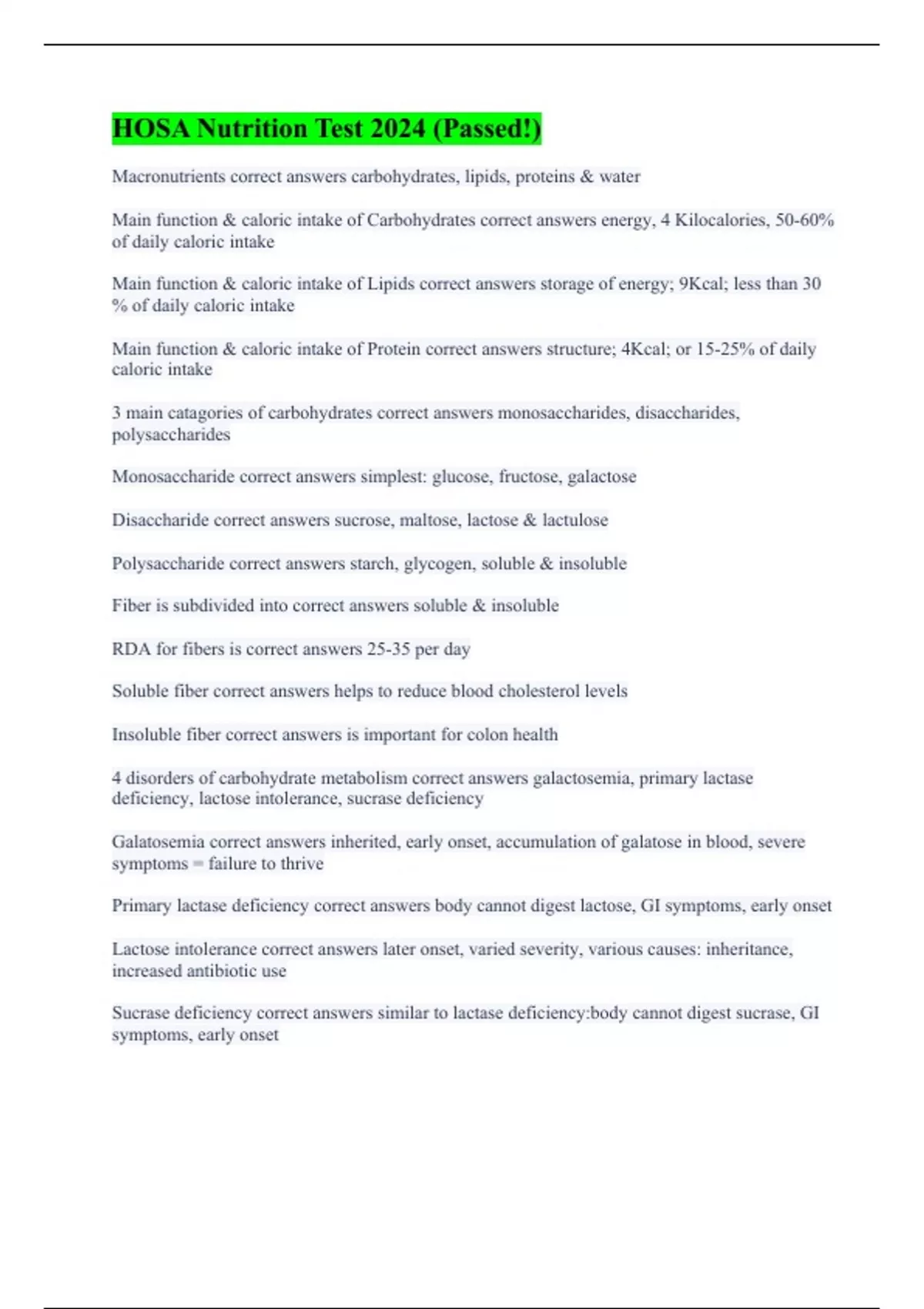 HOSA Nutrition Therapy (Well-enlightened) HOSA Nutrition throughout the life span (Well-enlightened) HOSA Nutrition throughout the lifespan (infancy, childhood, adulthood, the elderly, pregnancy, and lactation) 2024 (Questions with 100% accurate answers) HOSA Nutrition Vitamins and Minerals (With complete answers)