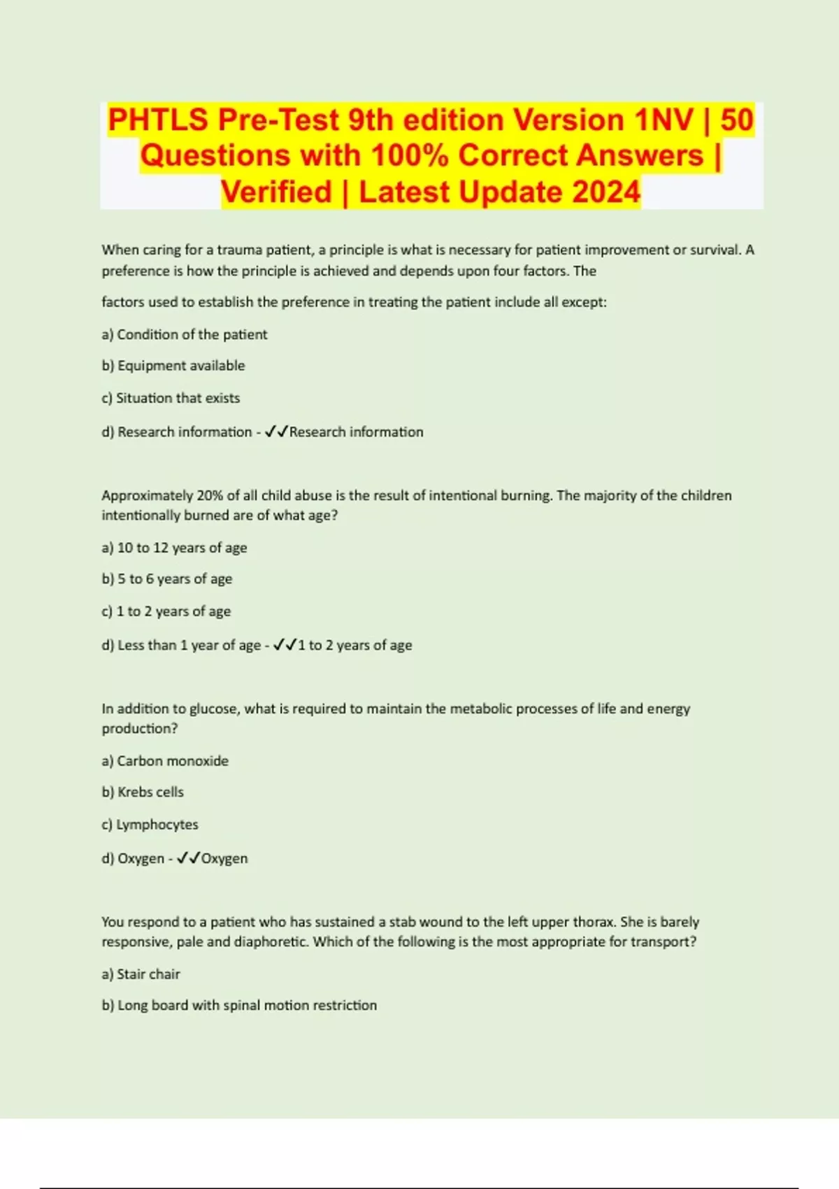 PHTLS Pre-Test 9th edition Version 1NV | 50 Questions with 100% Correct Answers | Verified | Latest Update 2024