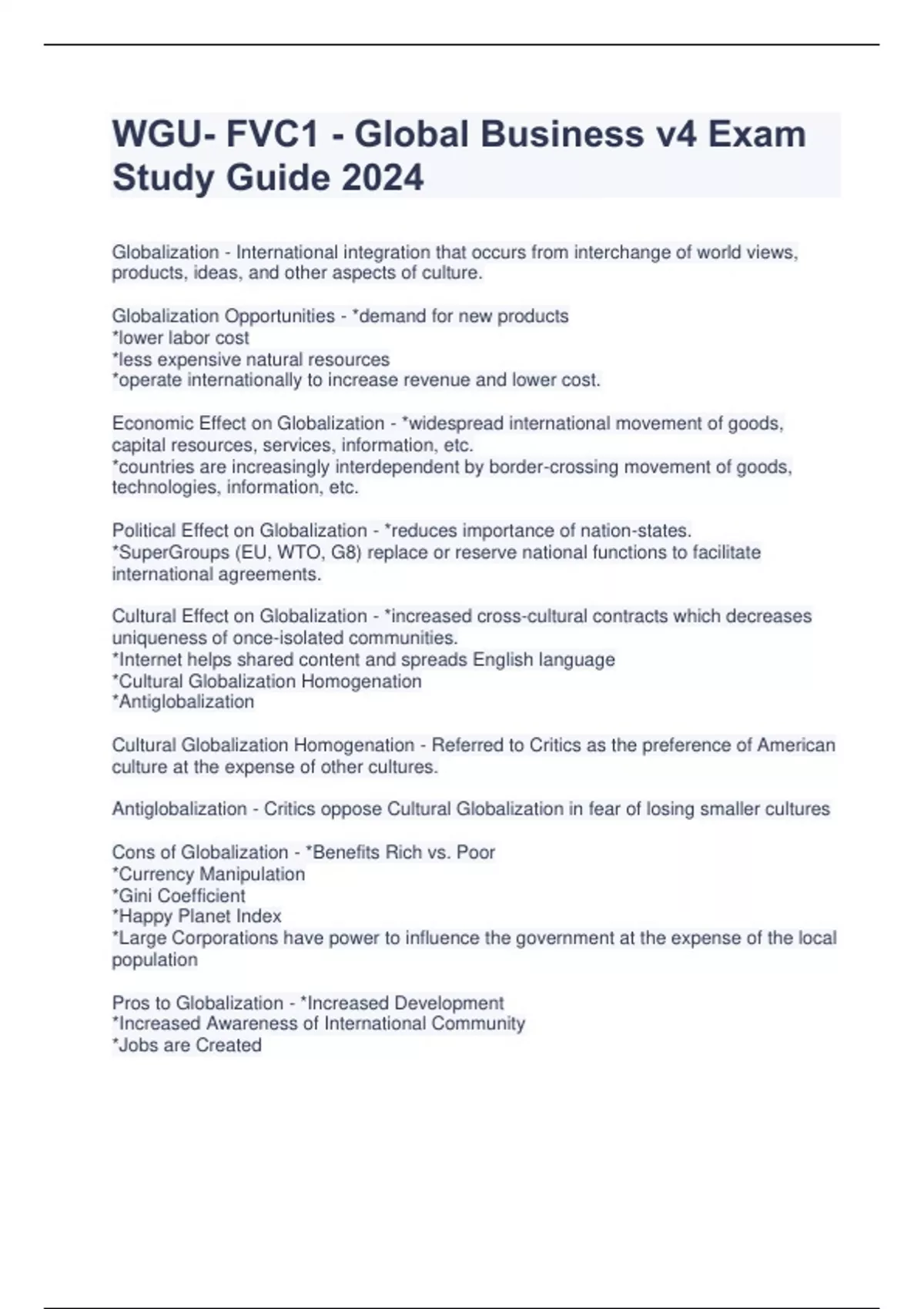 WGU- FVC1 - Global Business v4 Exam Study Guide 2024