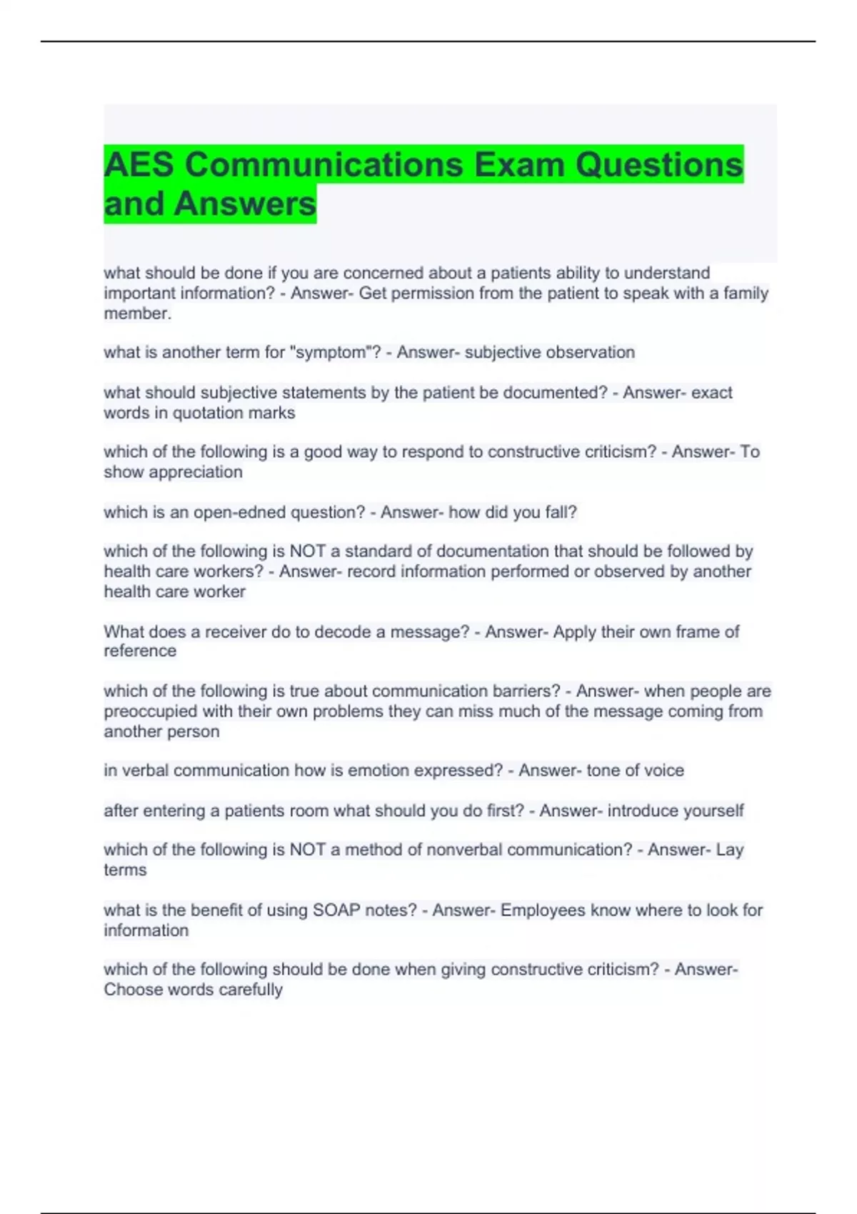 1 Exam (elaborations) AES Communications Exam Questions and Answers 2 Exam (elaborations) AES Communication Barriers Quiz 100% solved 3 Exam (elaborations) AES Communicating with Patients Exam 2024 Questions and Answers 4 Exam (elaborations) AES Basic Communications Exam Questions and Answers 5 Exam (elaborations) NYSTCE Educating All Students