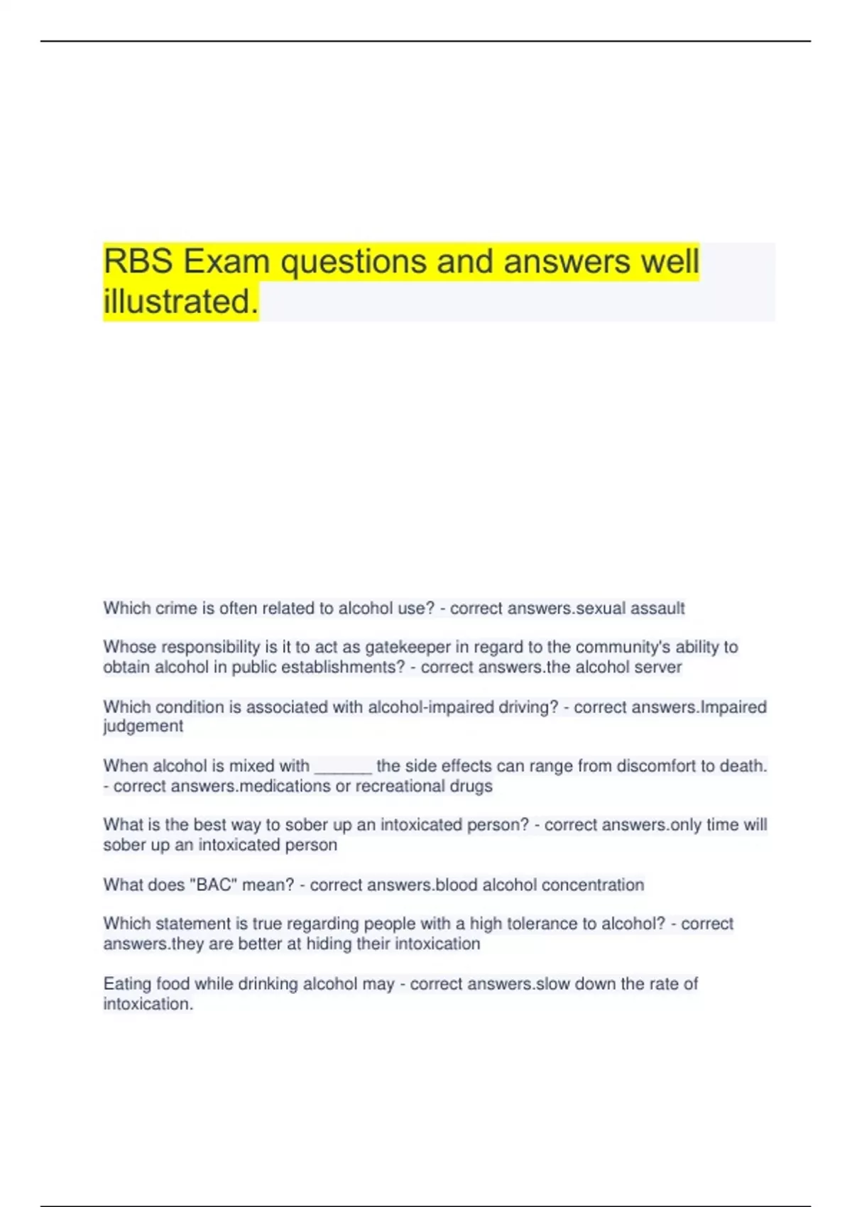 ServSafe Alcohol Practice Exam questions and answers 100% guaranteed success.Servsafe Alcohol Exam questions and answers 100% verified.ABC California questions and answers latest top score.ABC Server Training Study Guide questions and answers well illustrated.